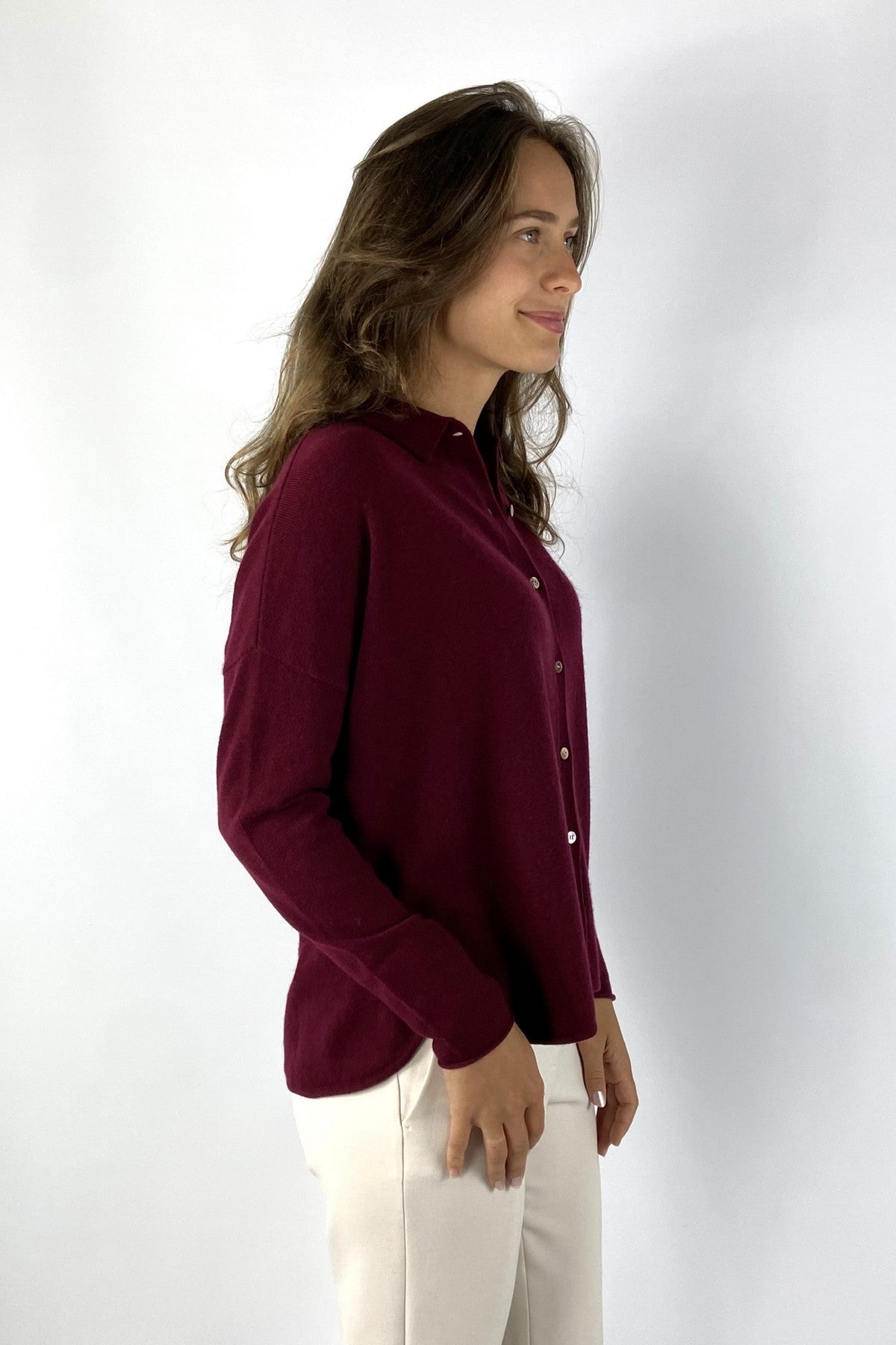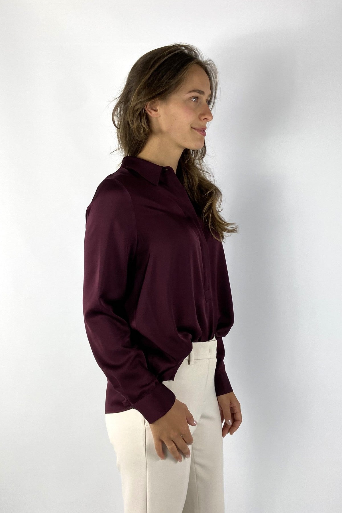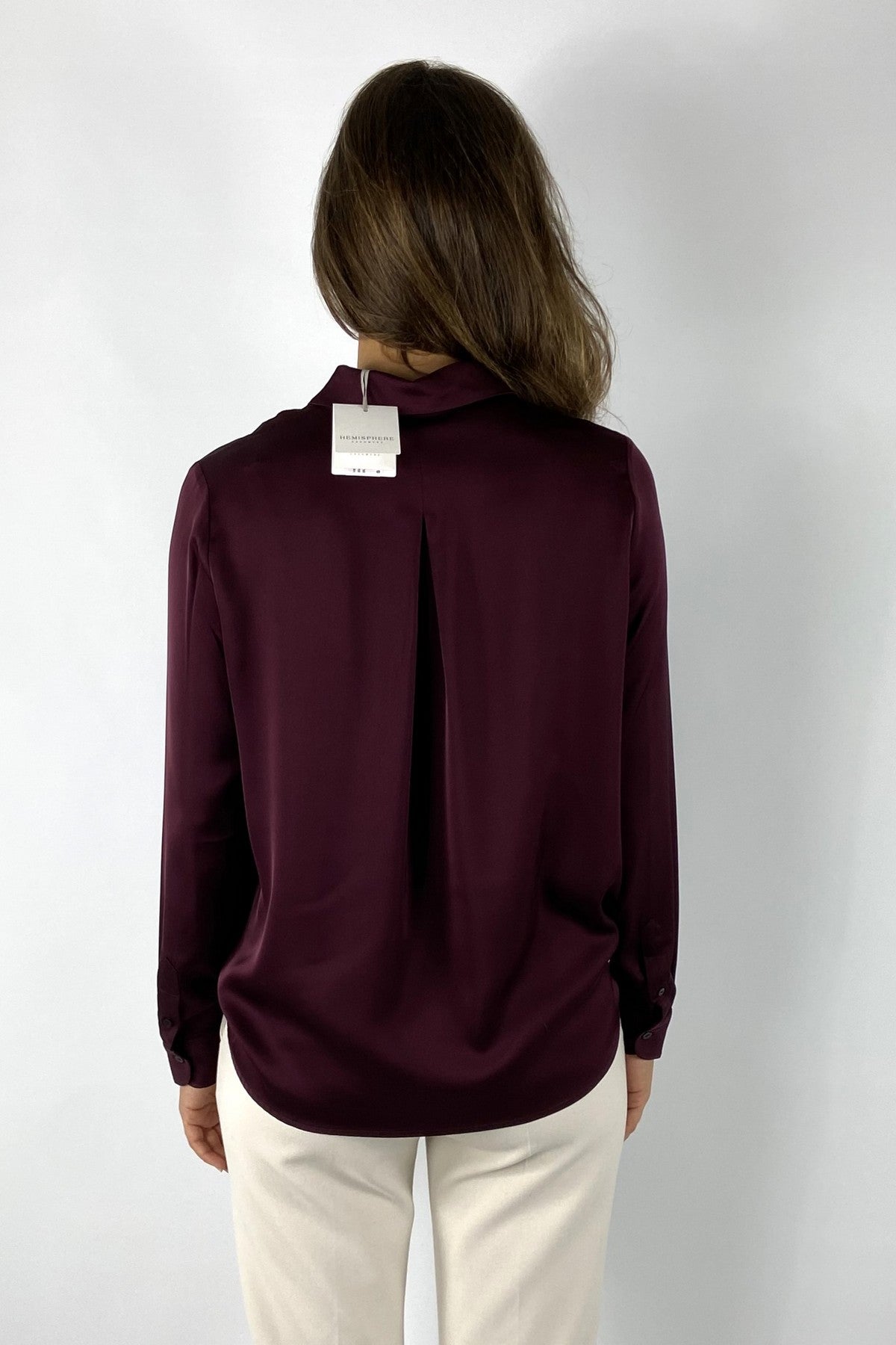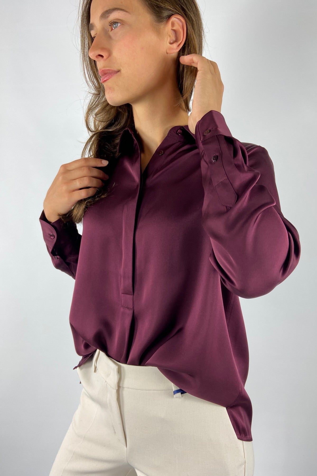 Elegante zijden blouse van Hemisphere in burgundy. Stretchzijde met subtiele glans, tuniekstijl met verkorte knoopsluiting.