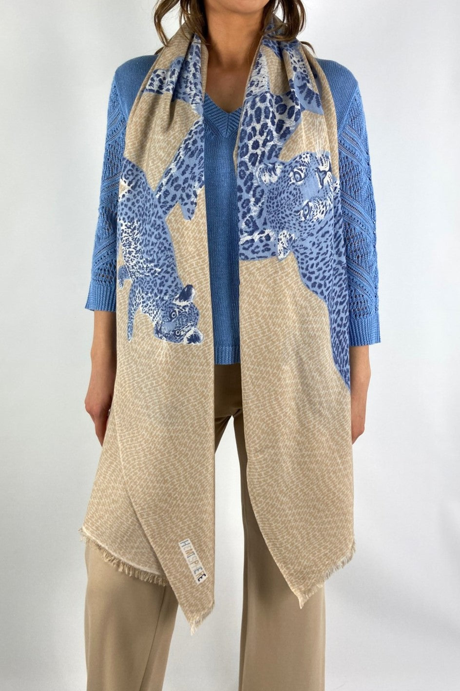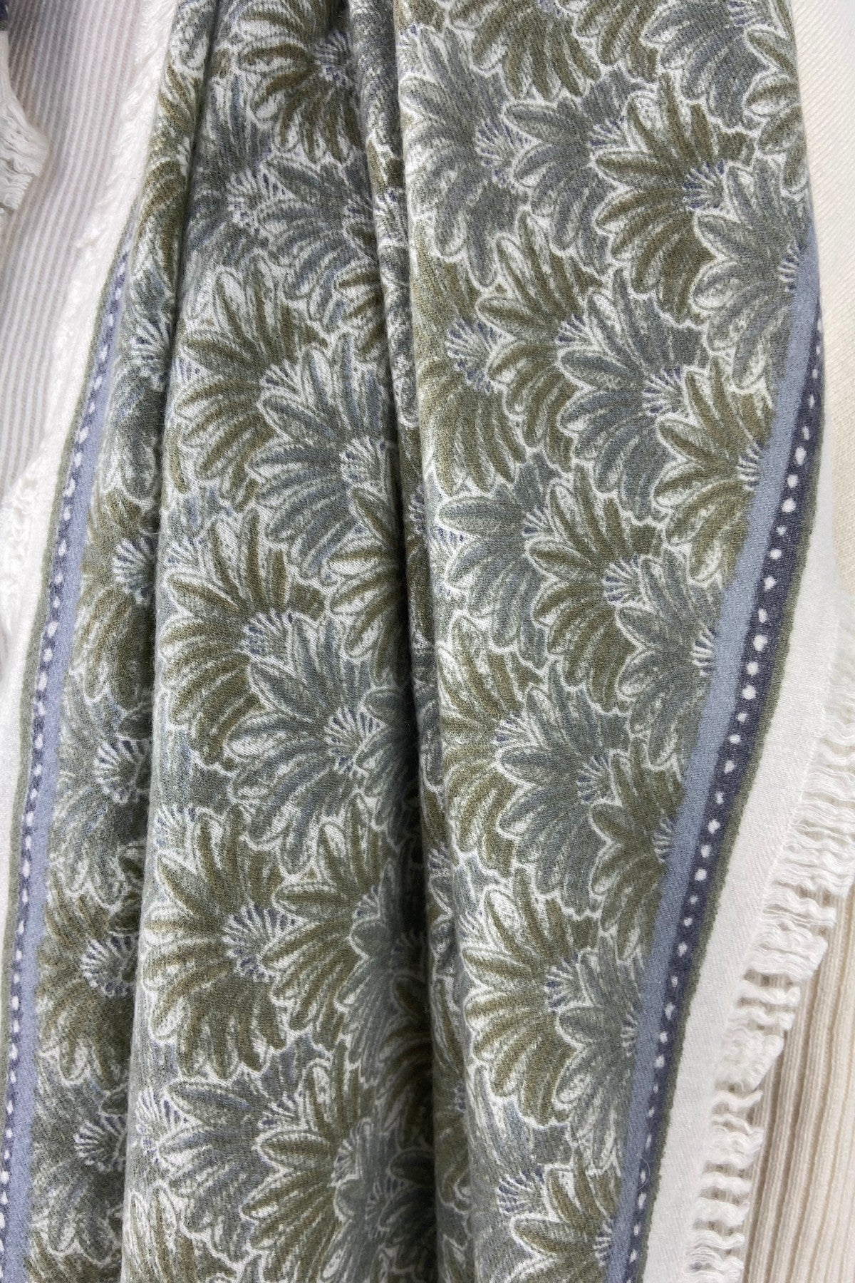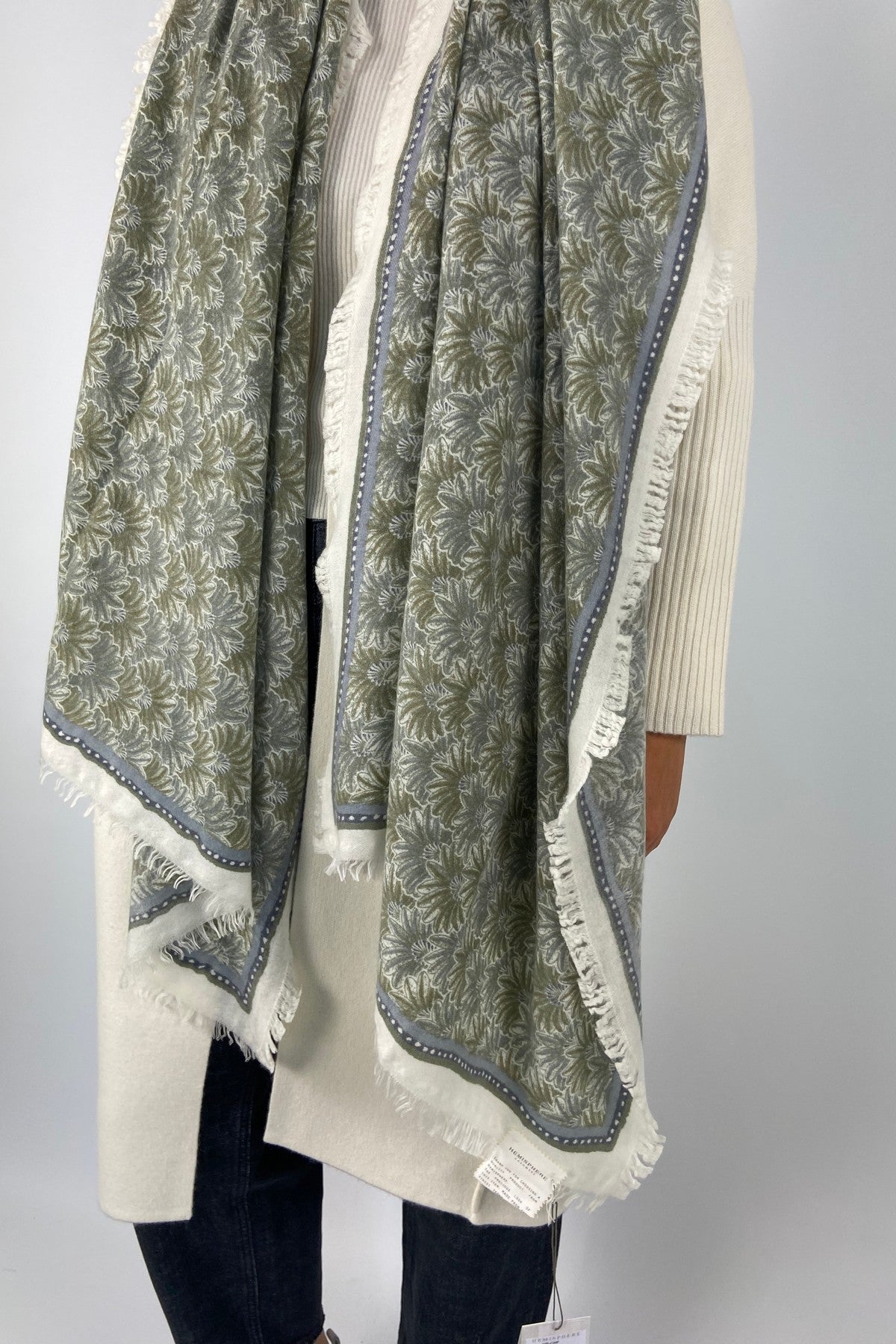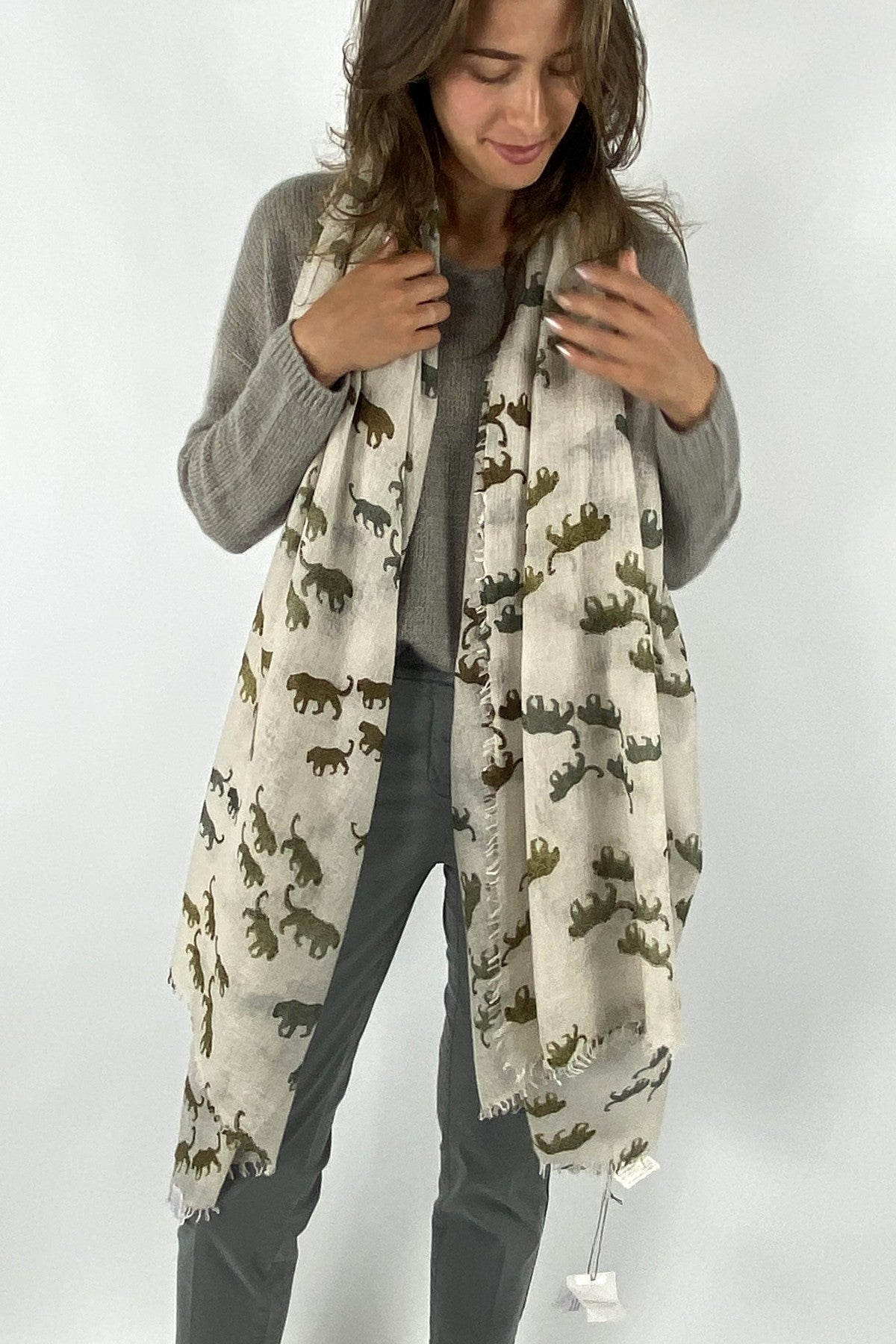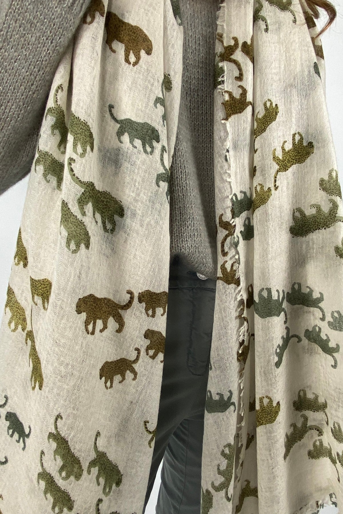 Lichte en zachte sjaal van Hemisphere in crème en groen met trendy luipaarddessin en franjes.