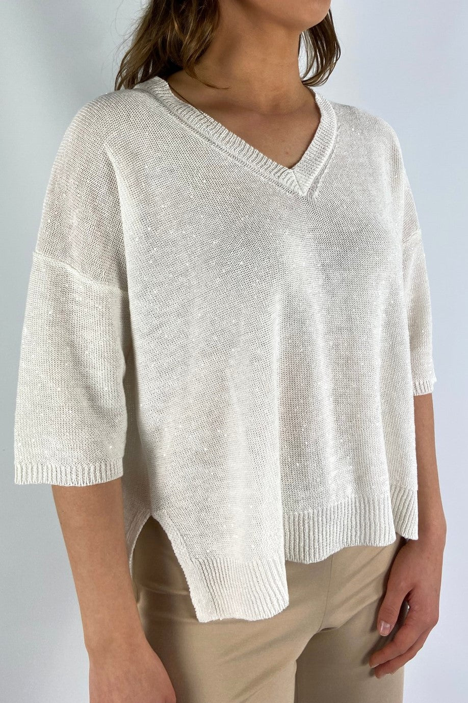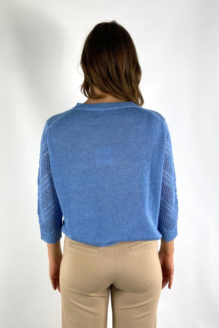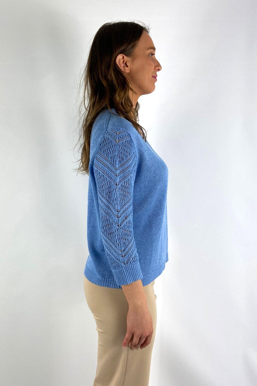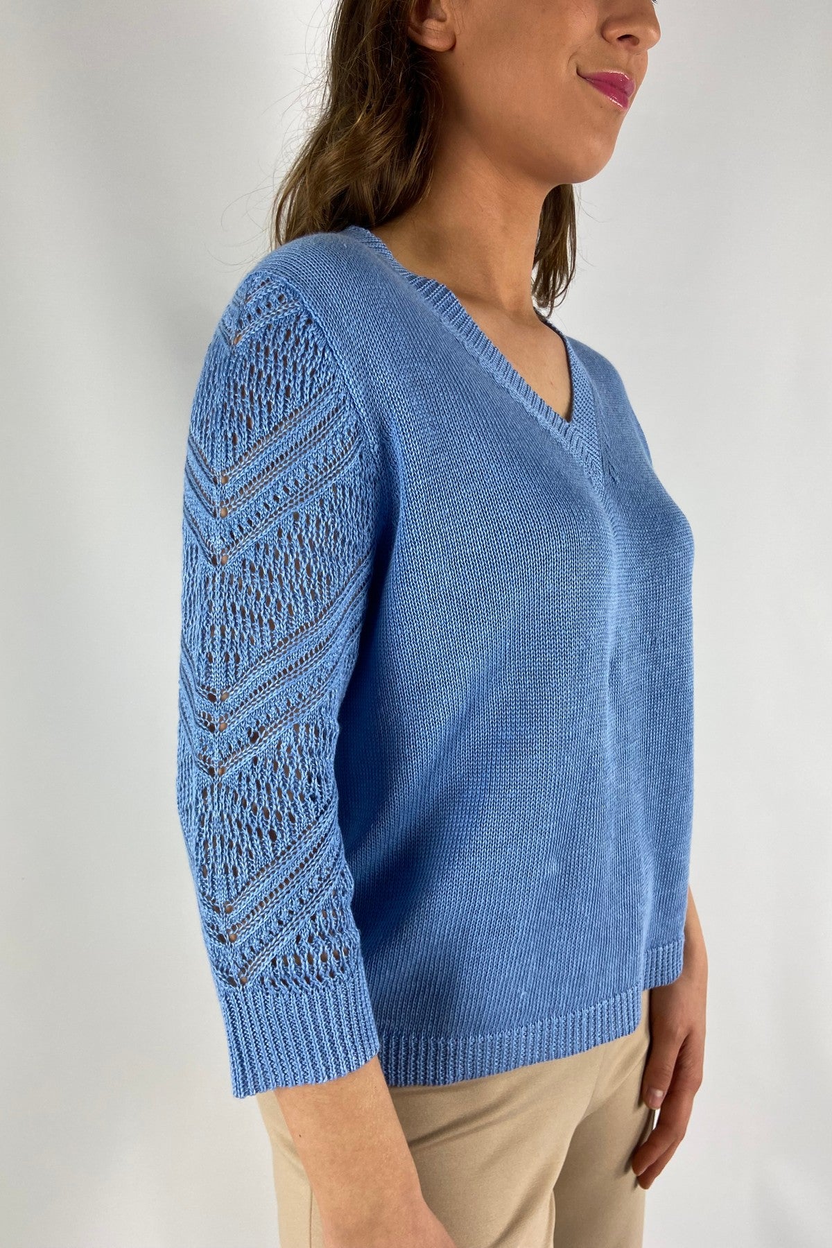 Vrouwelijk linnen truitje van Hemisphere met V-hals en fantasiebreiwerk op de mouwen, licht en ademend
