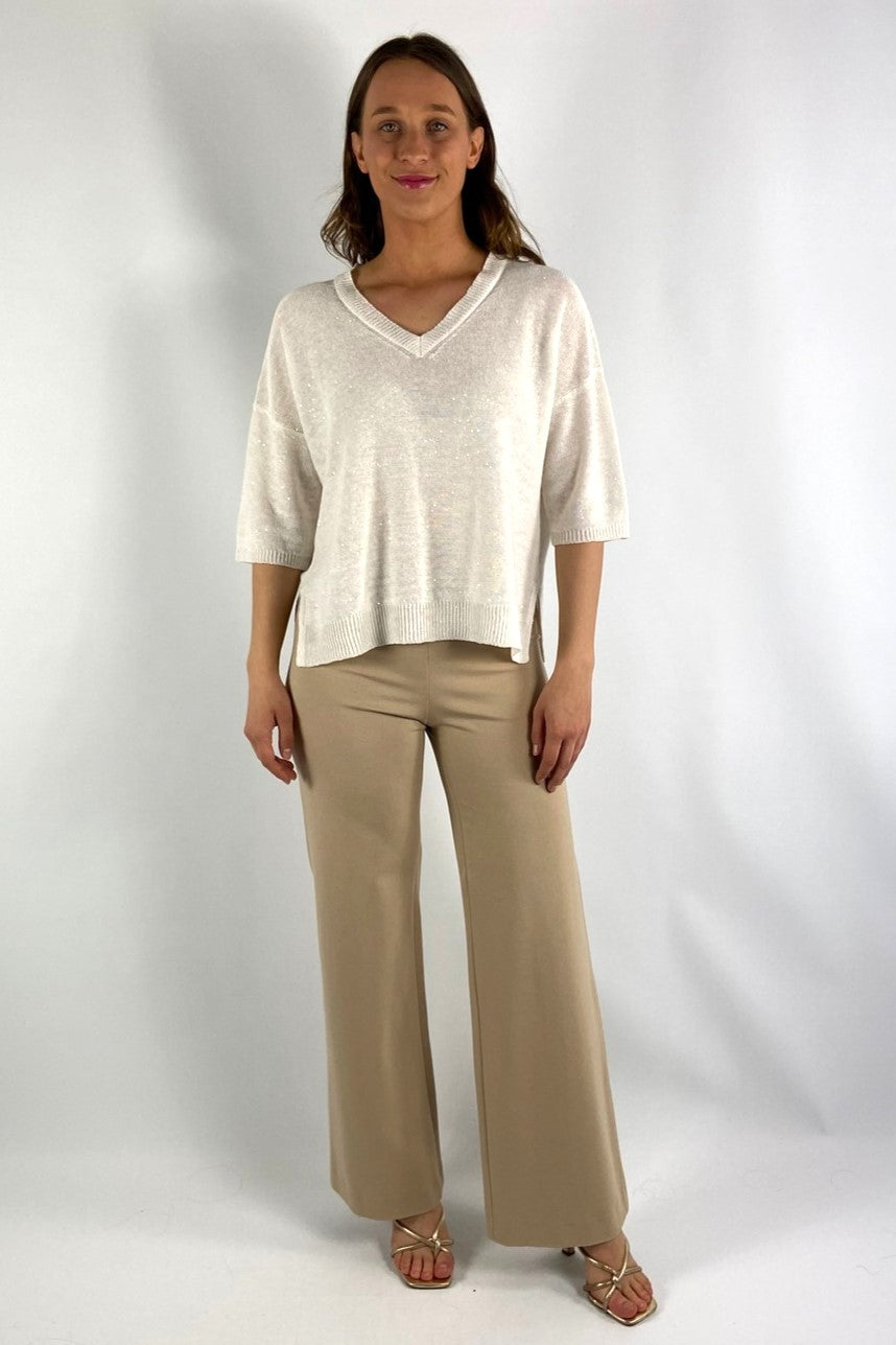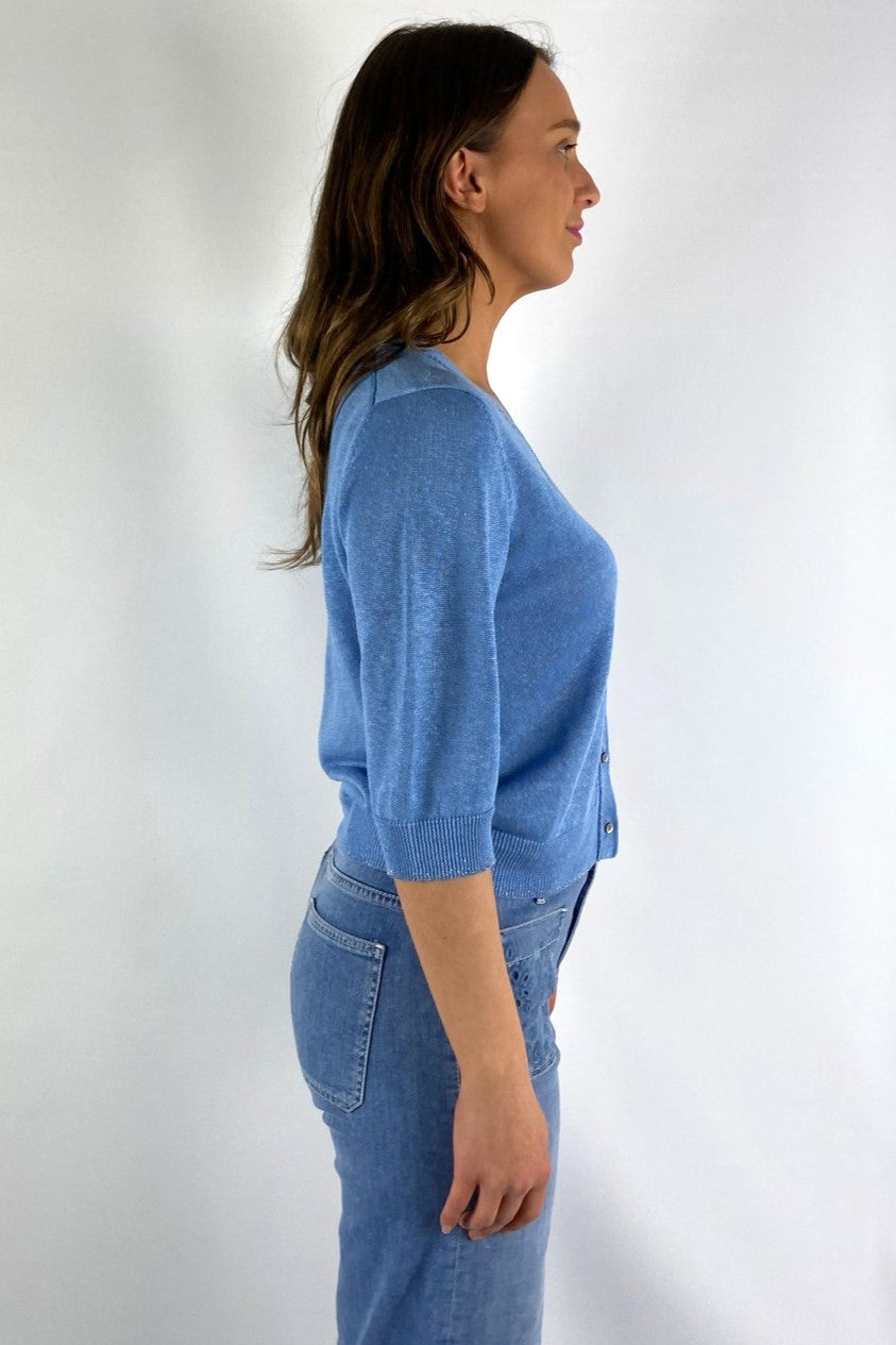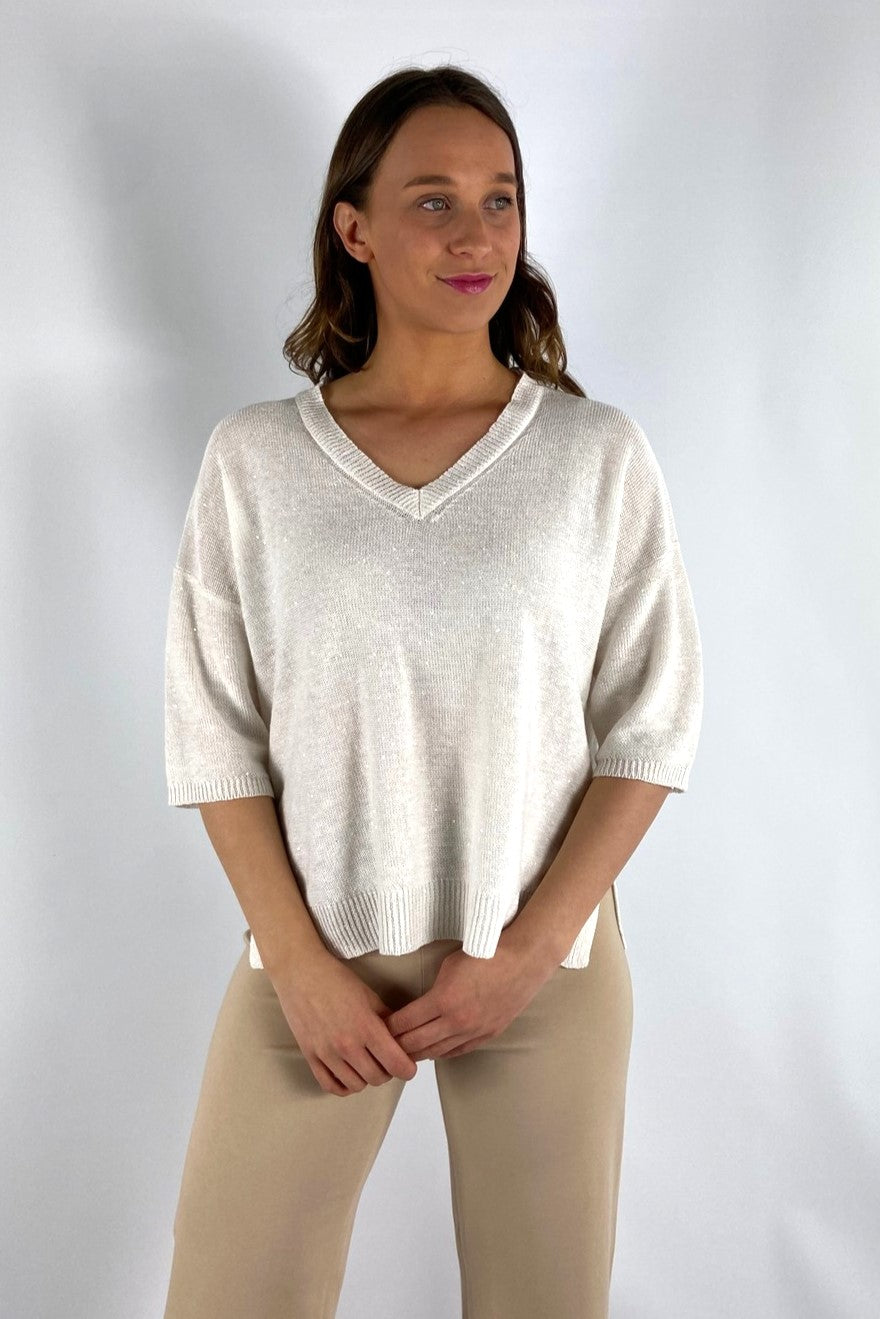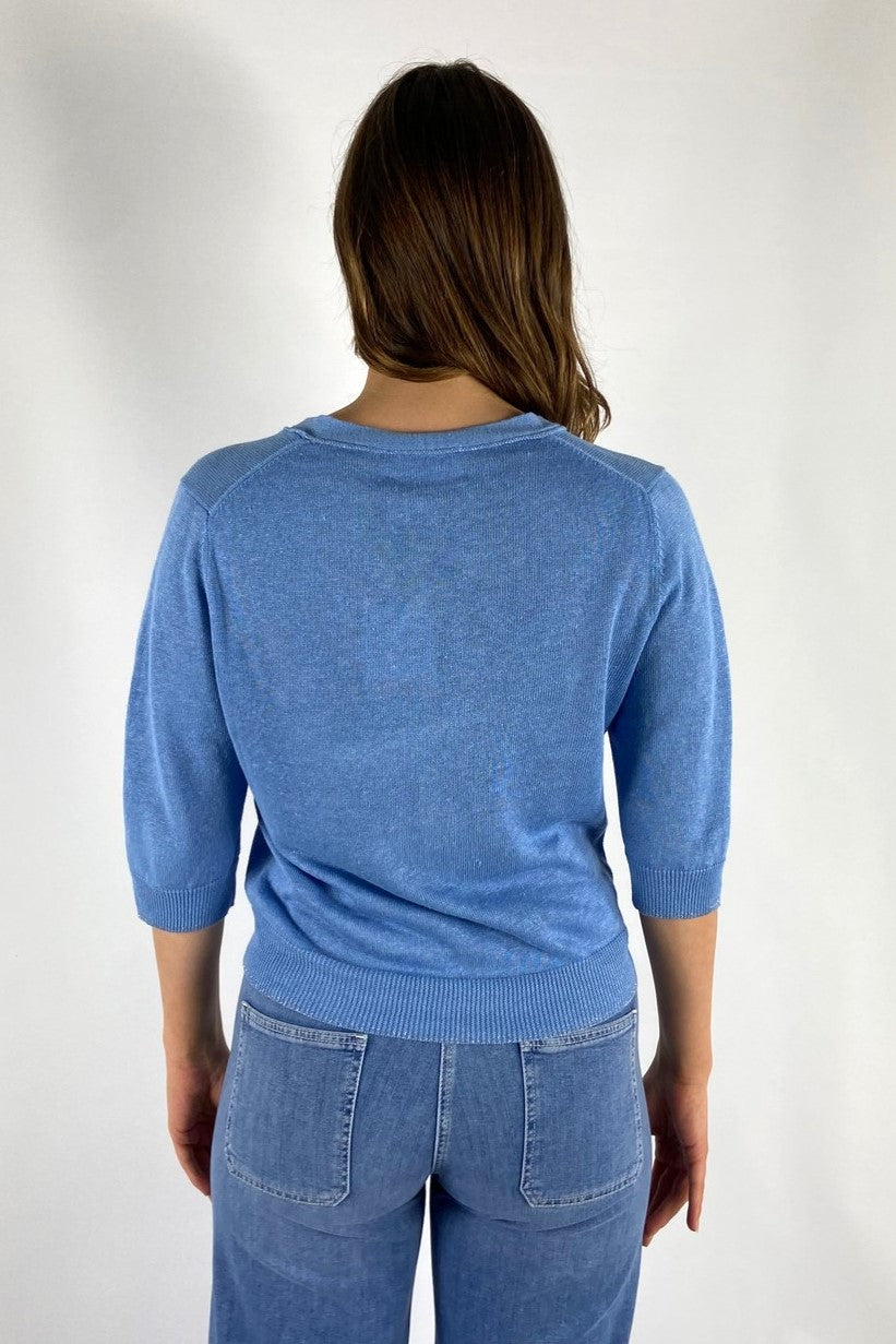 Vrouwelijk linnen truitje van Hemisphere met V-hals en fantasiebreiwerk op de mouwen, licht en ademend