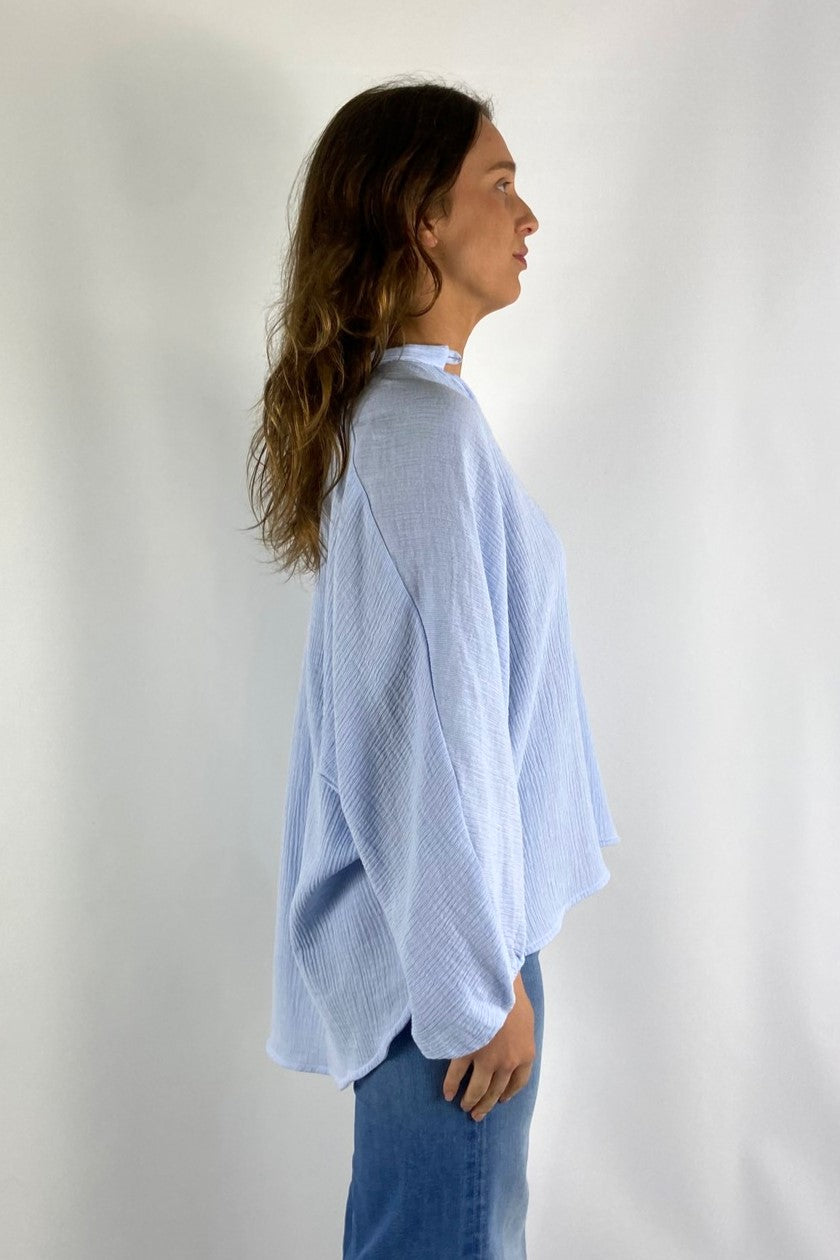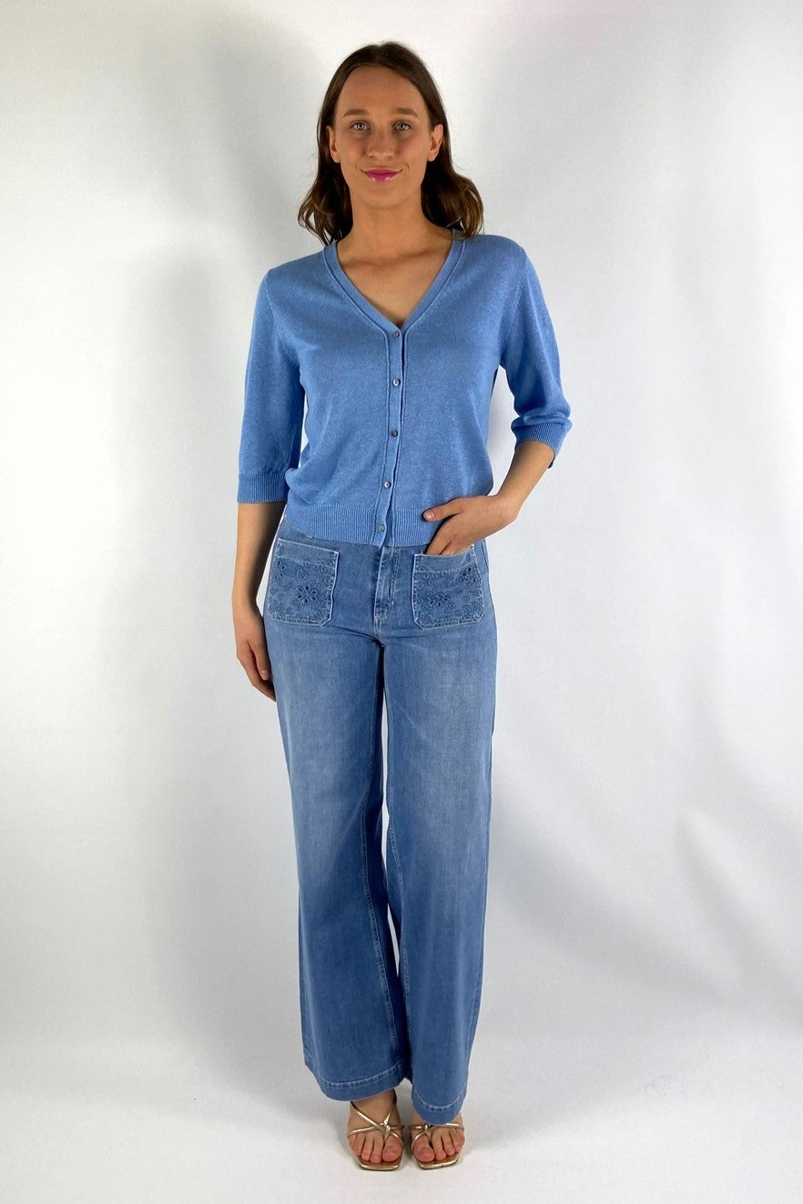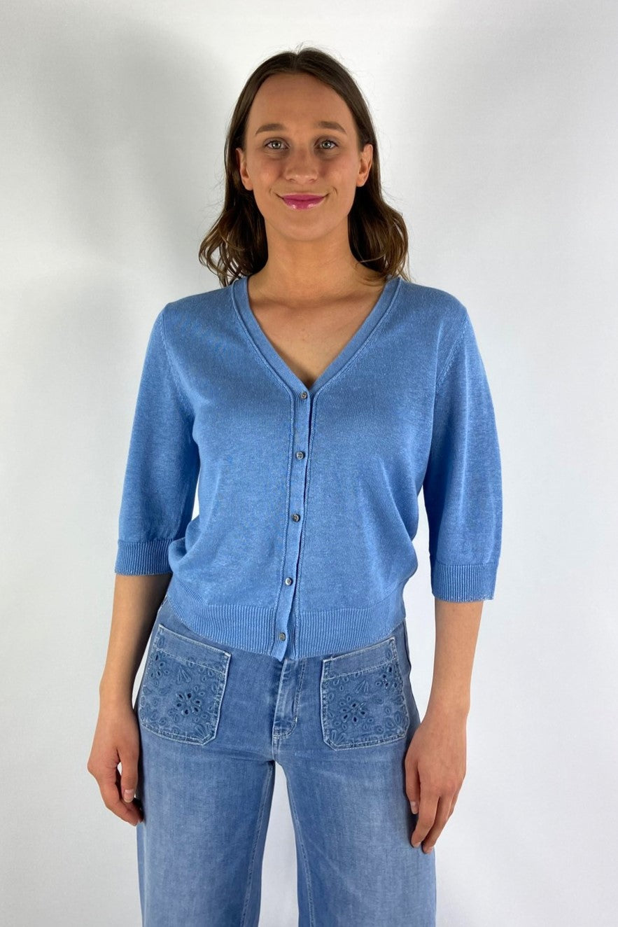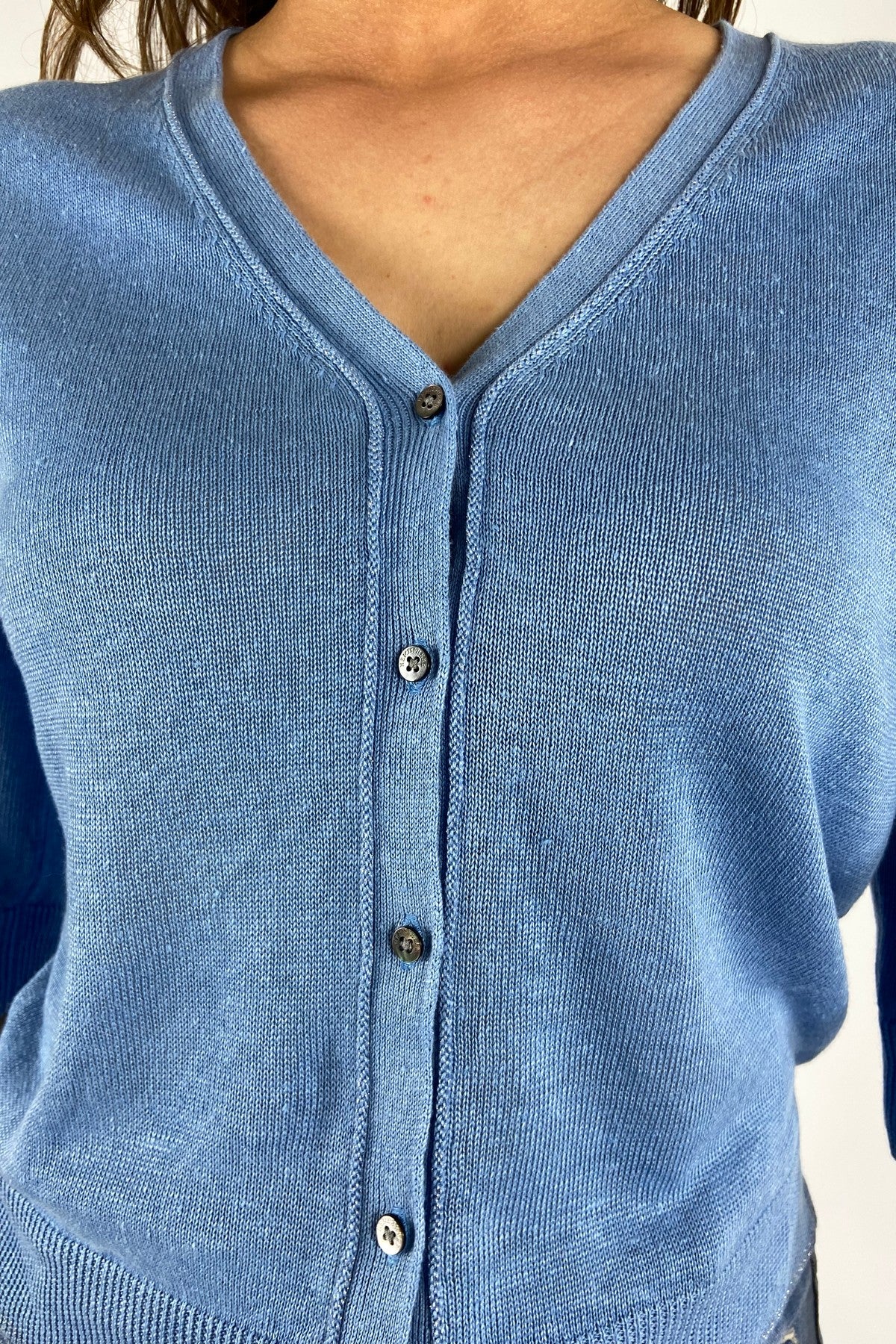 Vrouwelijk linnen truitje van Hemisphere met V-hals en fantasiebreiwerk op de mouwen, licht en ademend