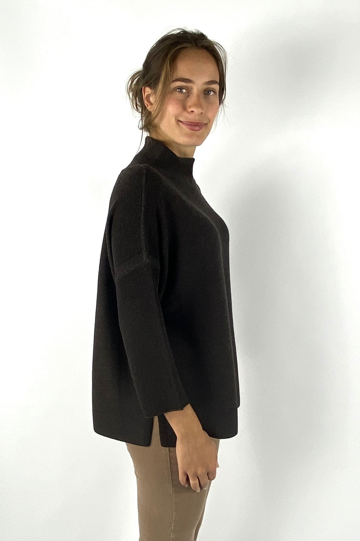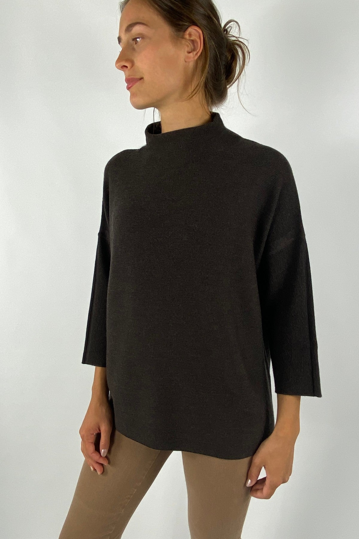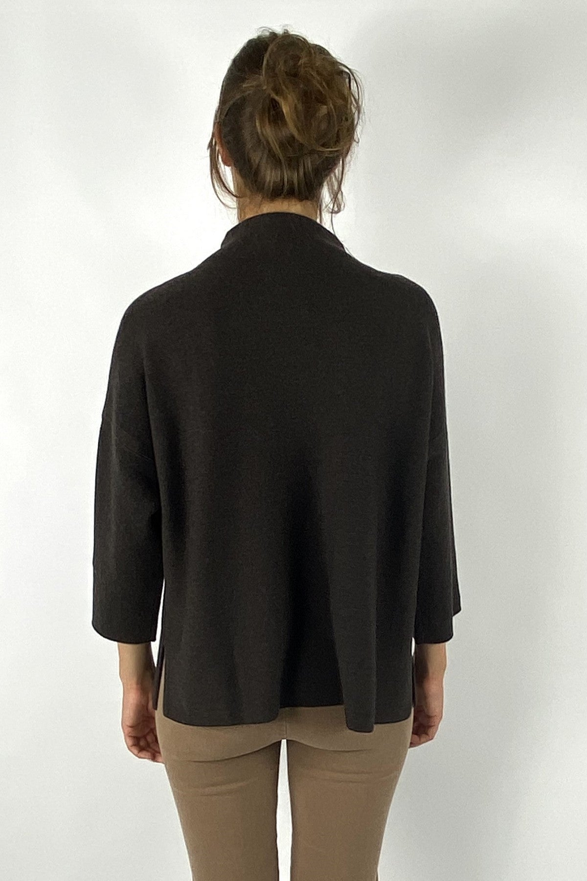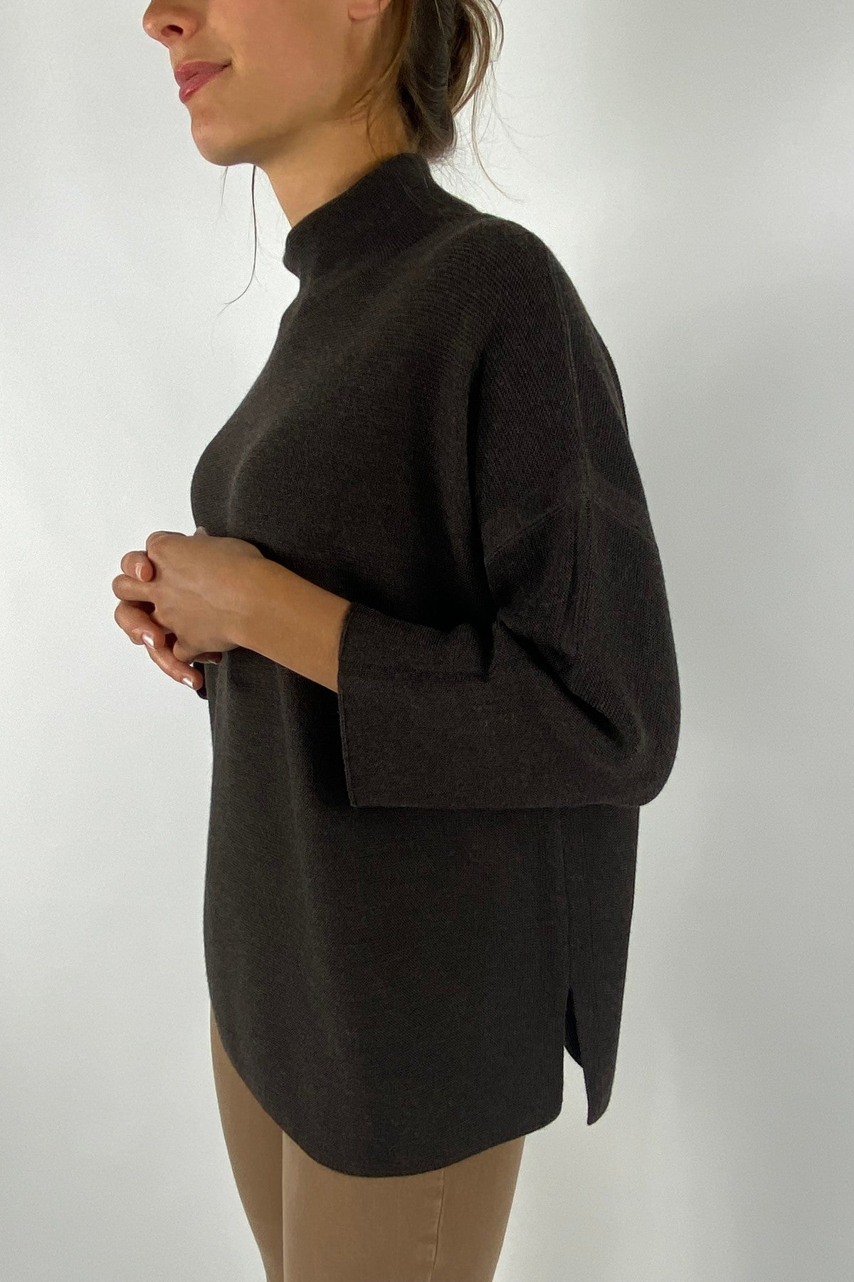 Lossere donkerbruine pull met opstaande kraag in merinos wol.