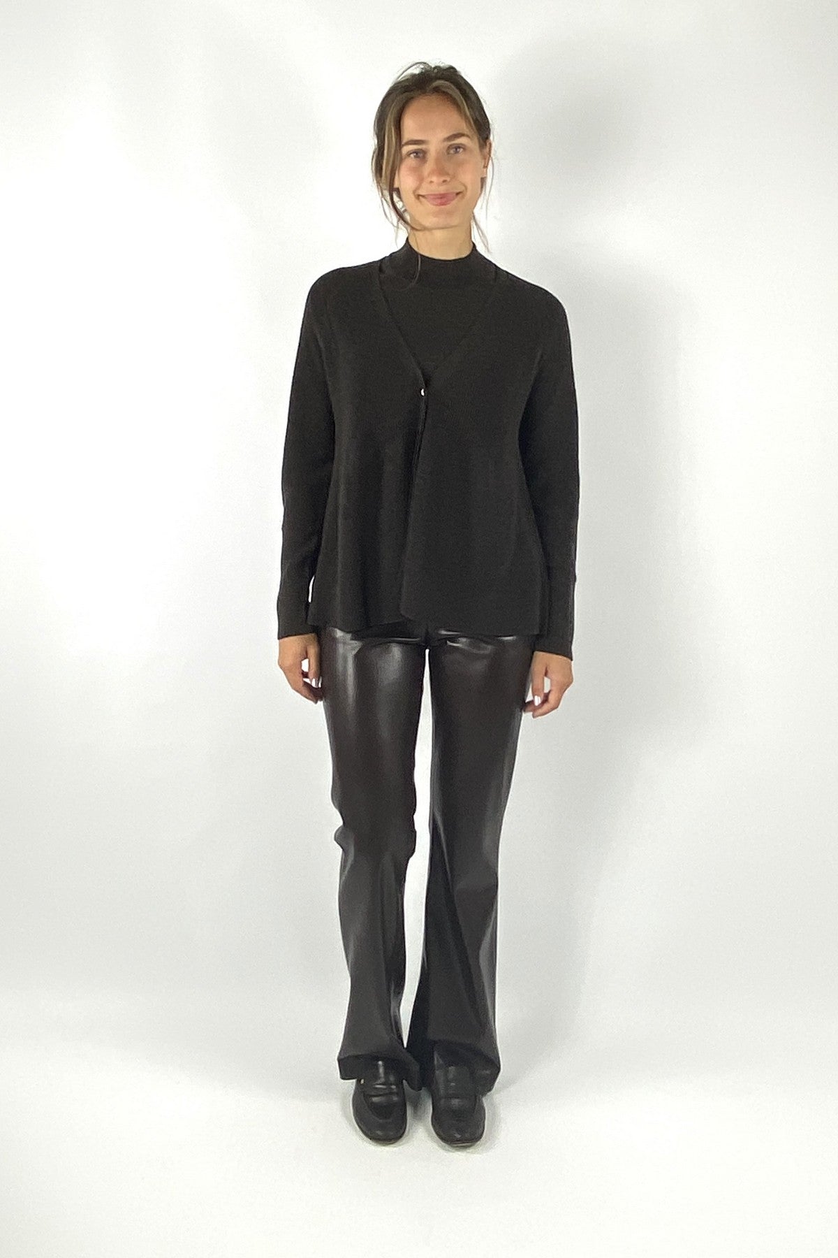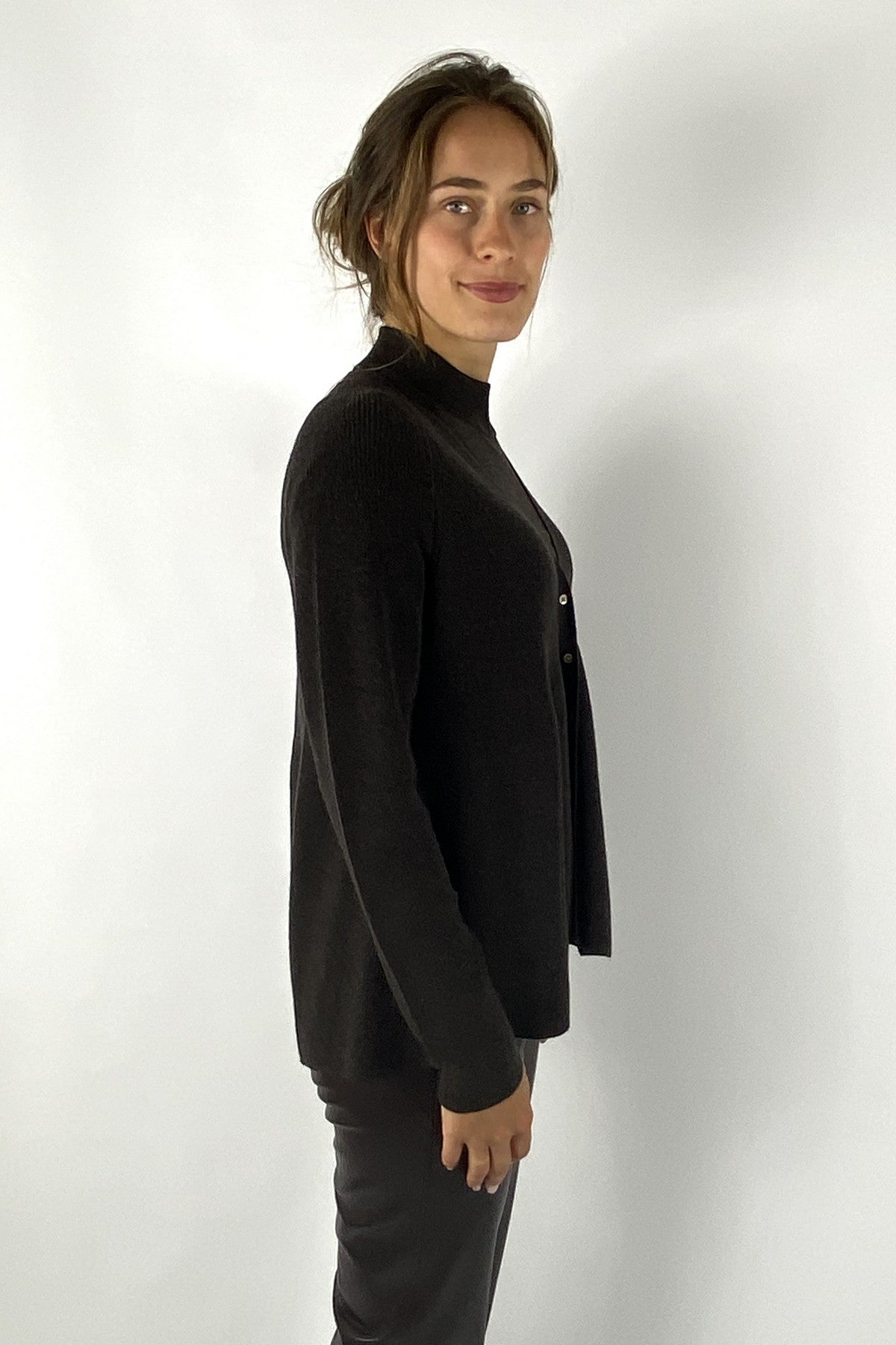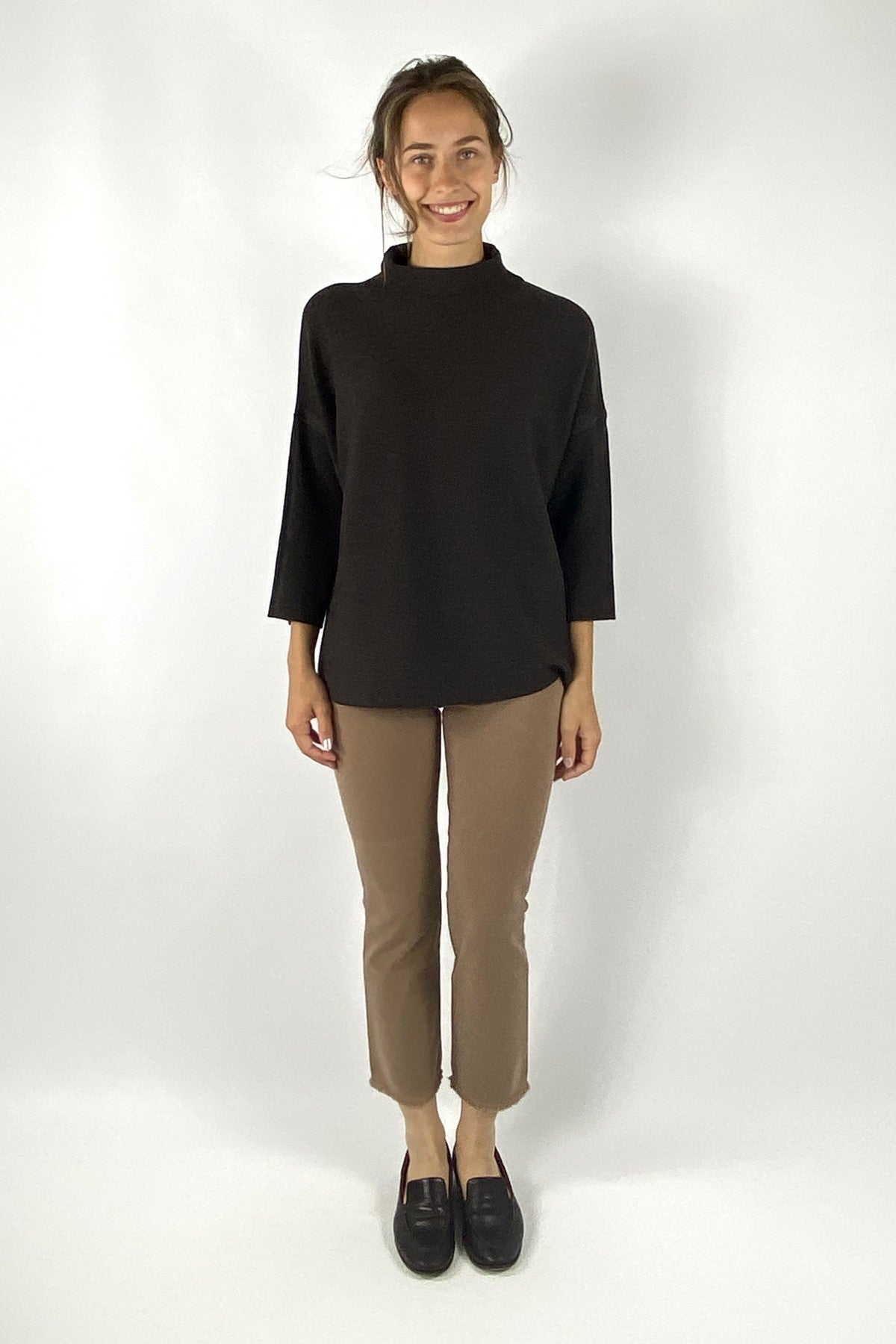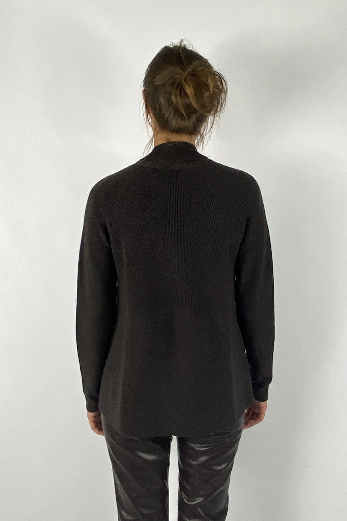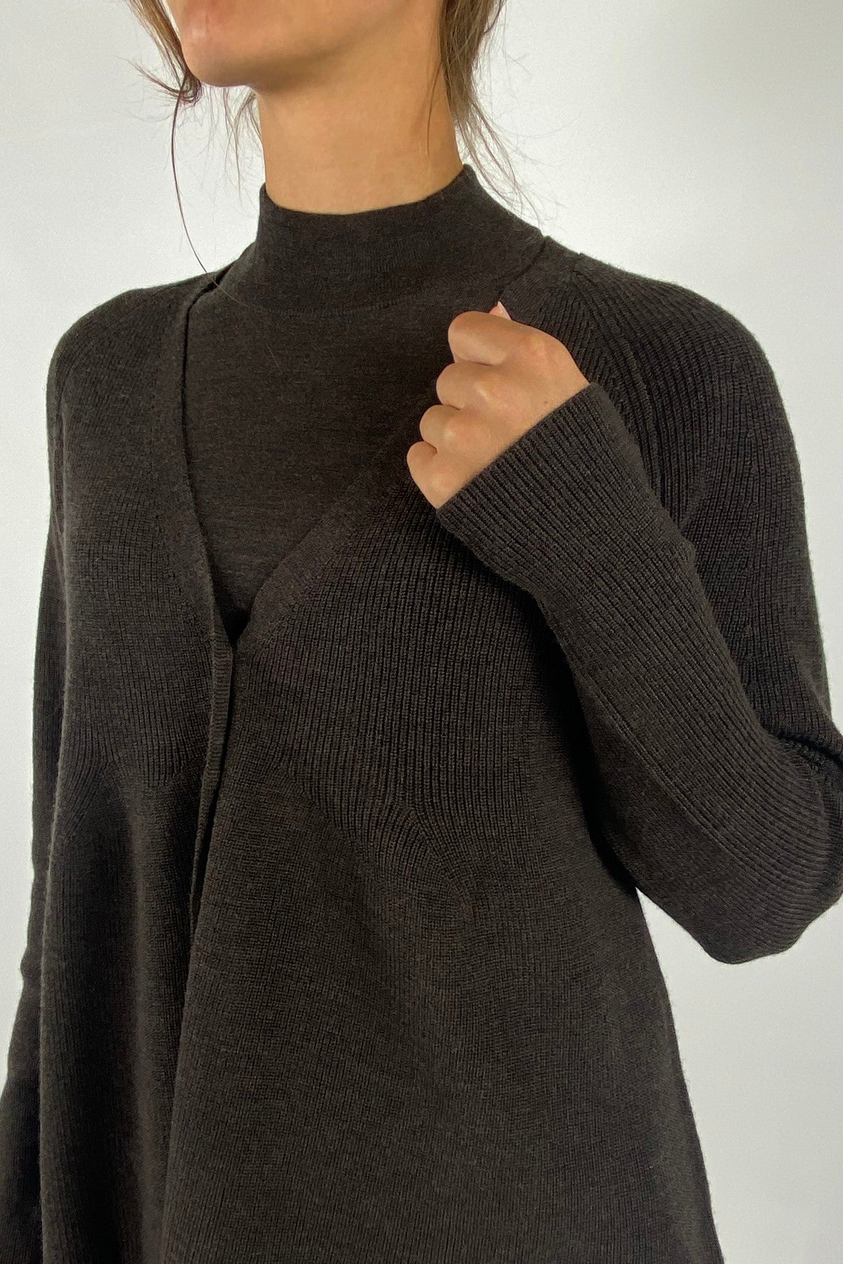 Lossere donkerbruine pull met opstaande kraag in merinos wol.