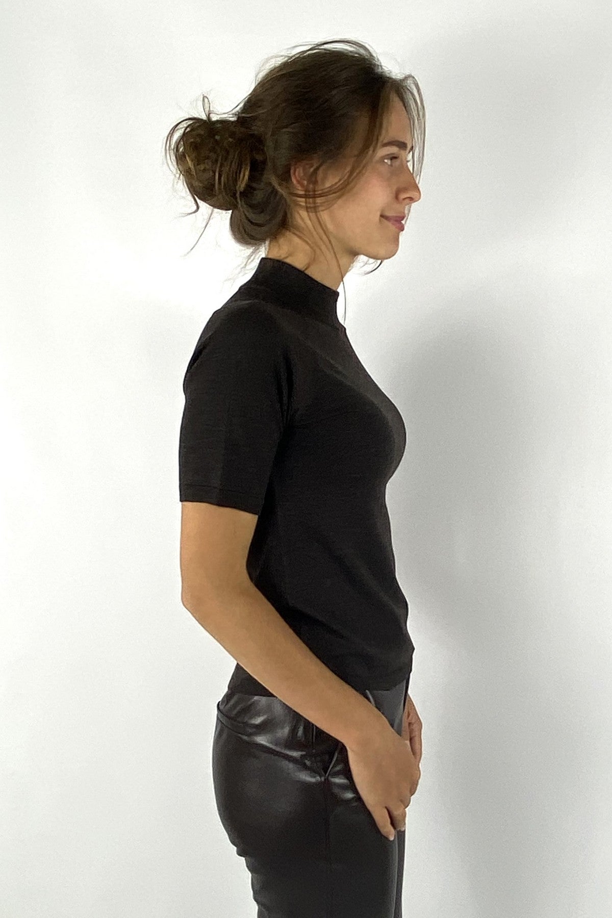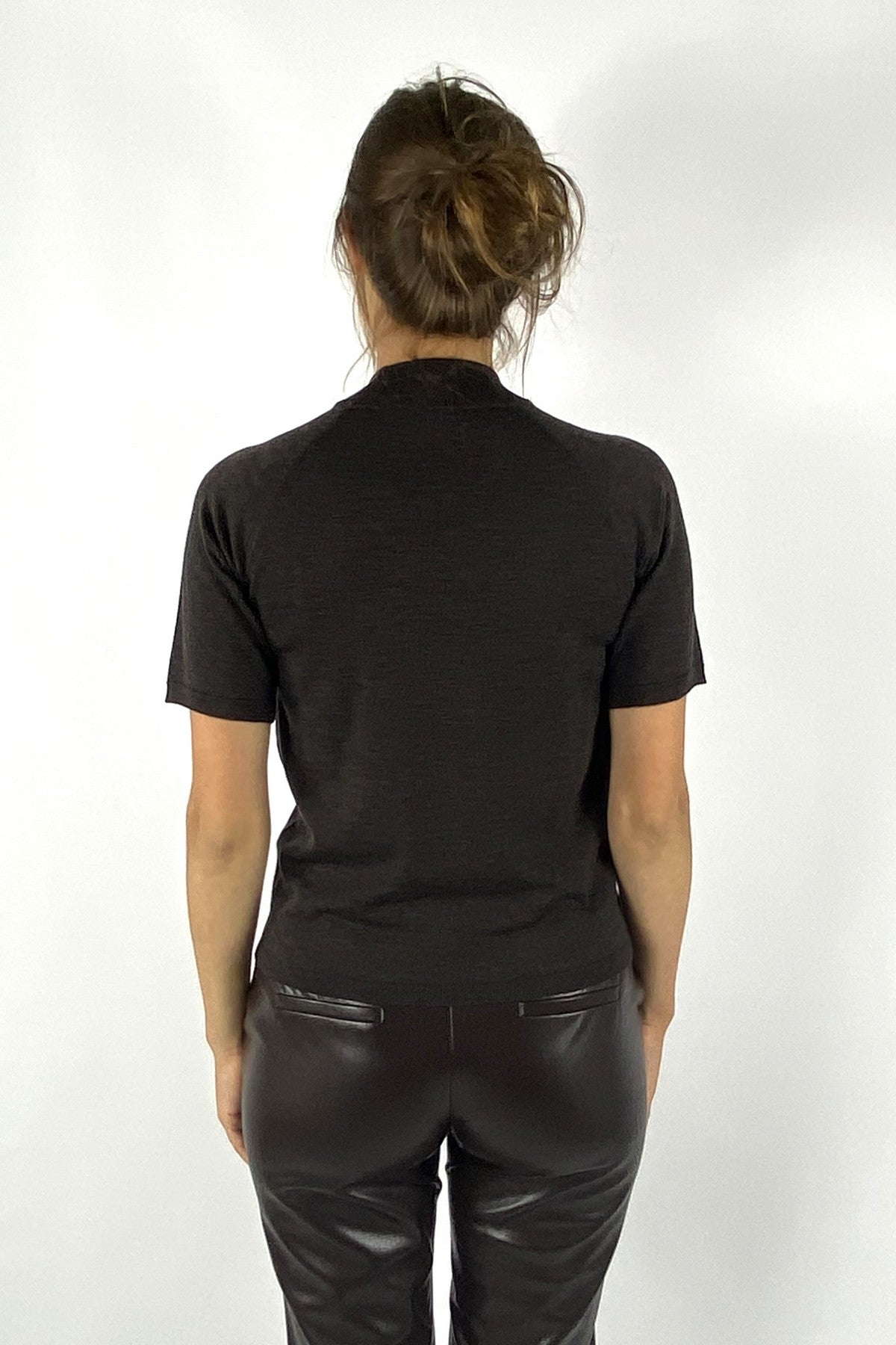 Truitje in donkerbruin met korte mouwen in een comfortabele wolstretch kwaliteit.