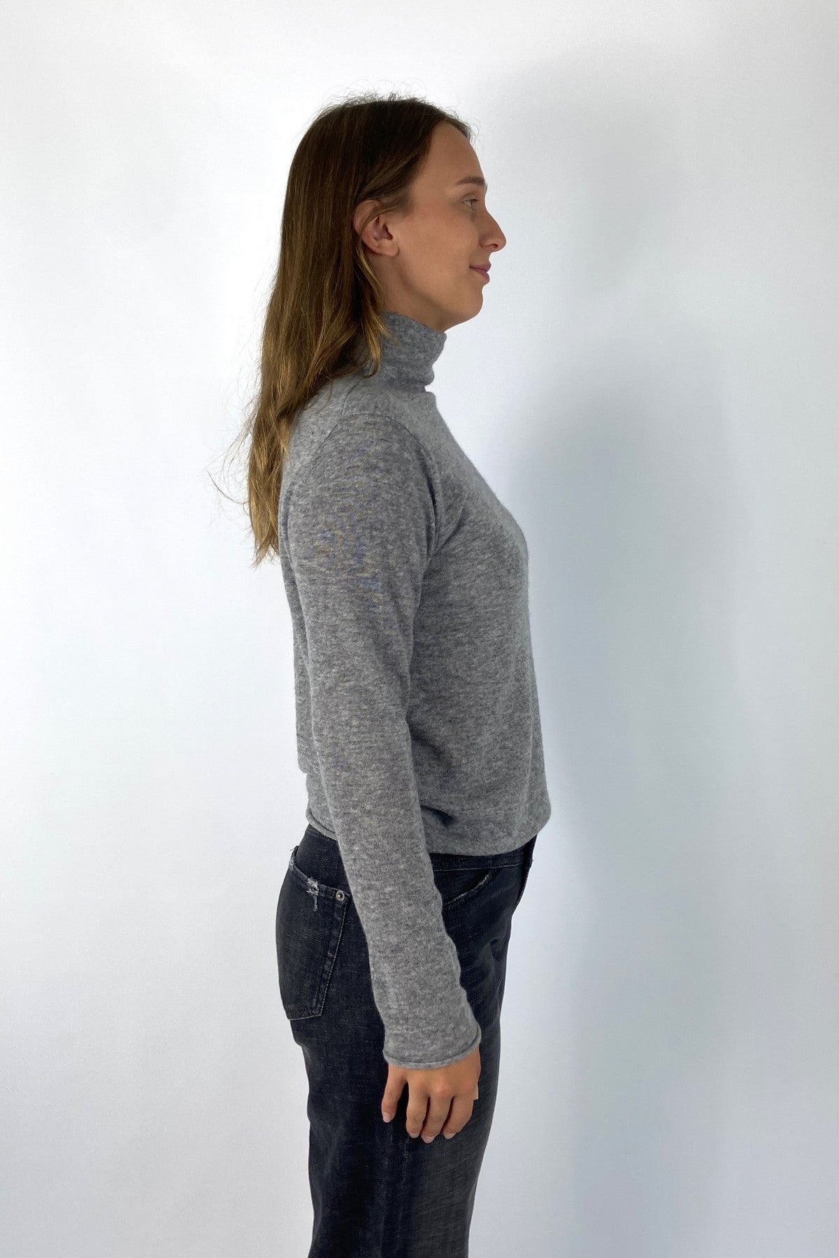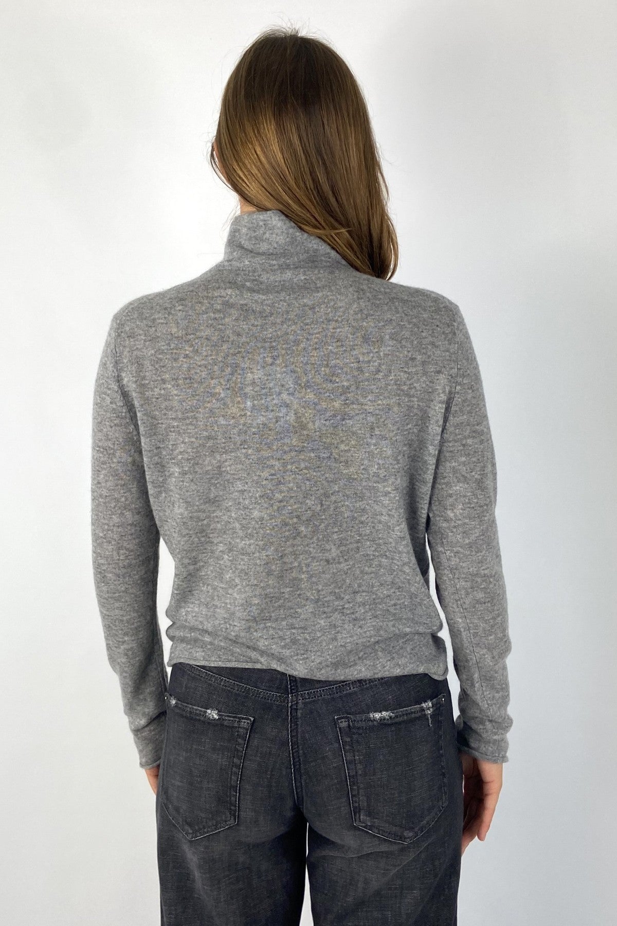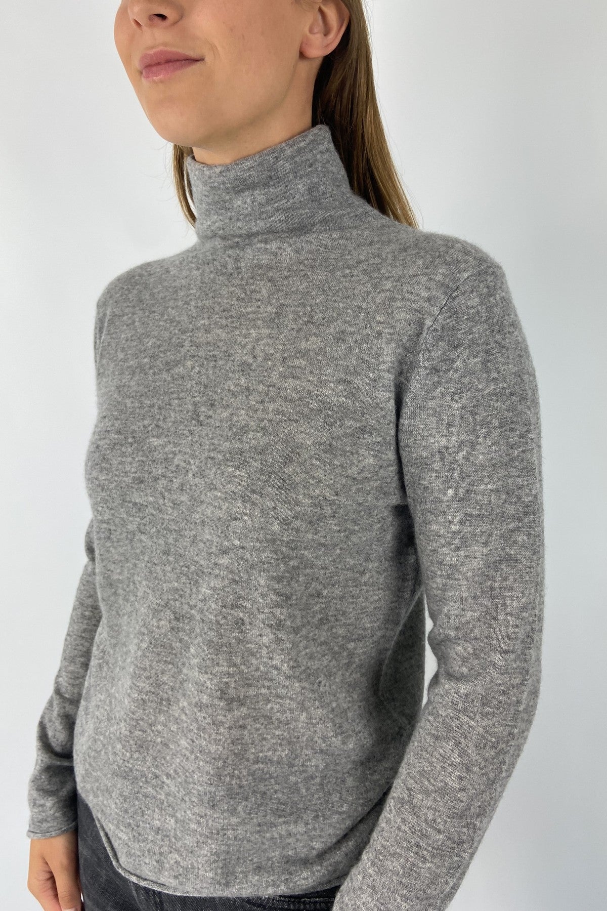 Truitje met rolkraag in middengrijs die uitzonderlijk zacht en aangenaam voelt door de 100% cashmere brei.