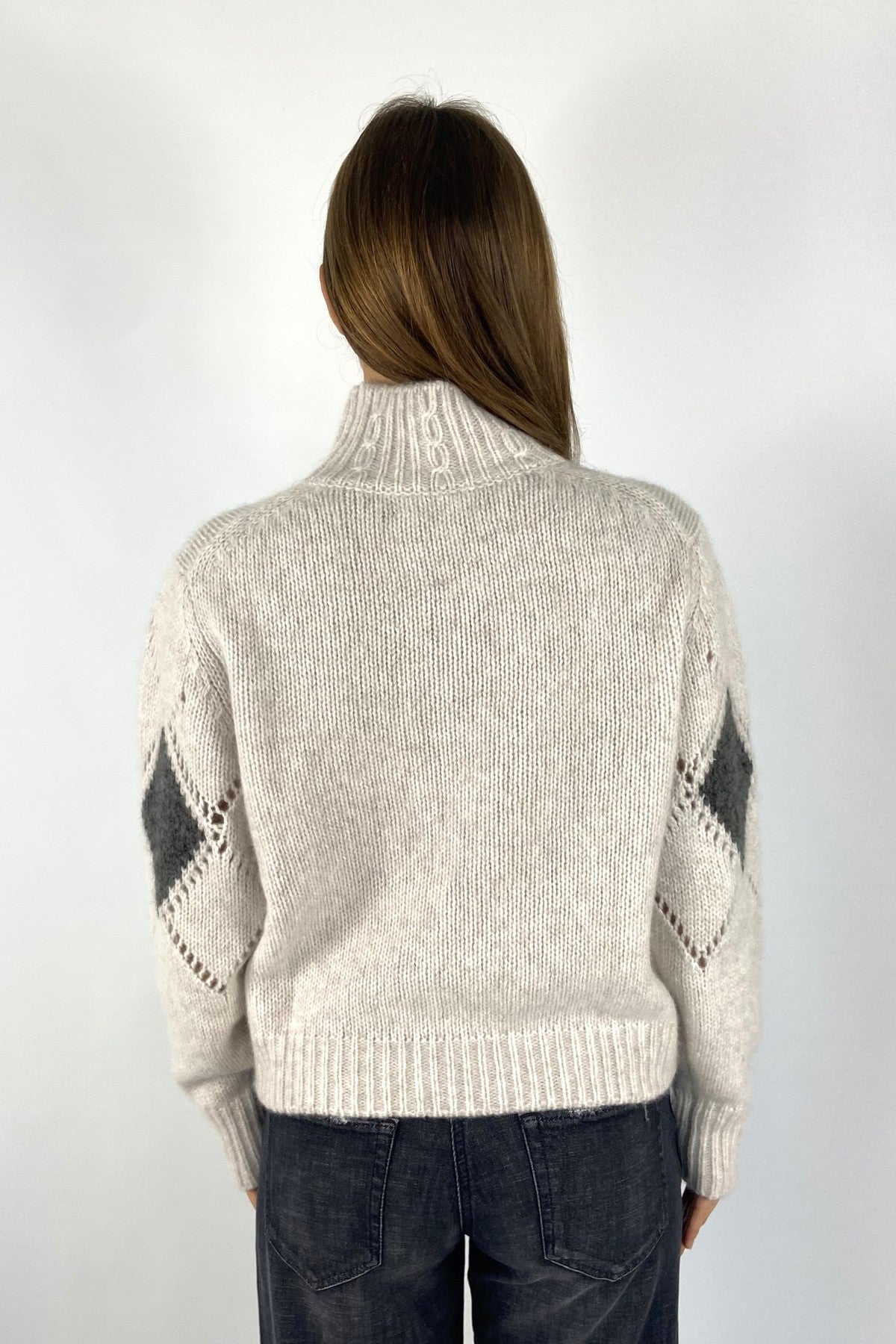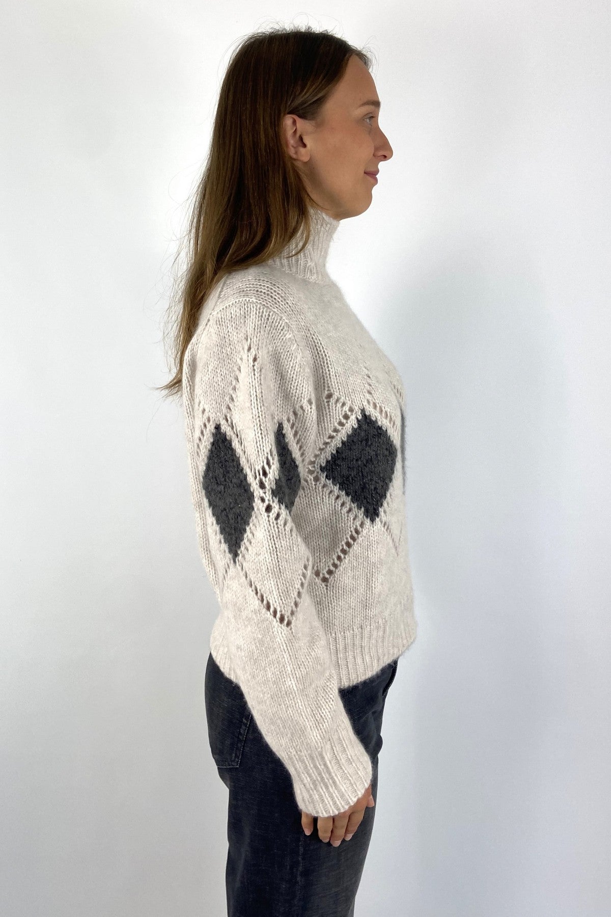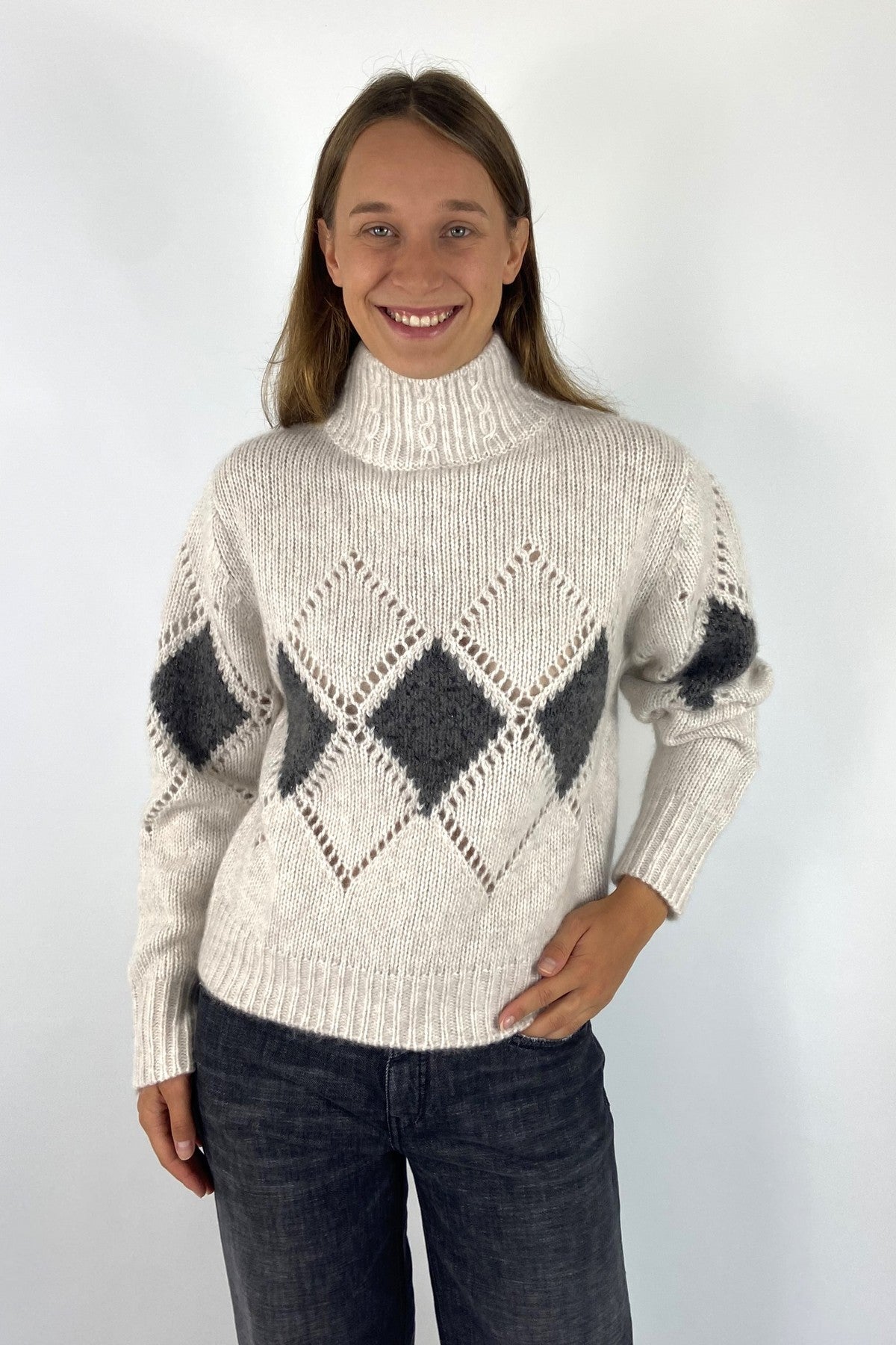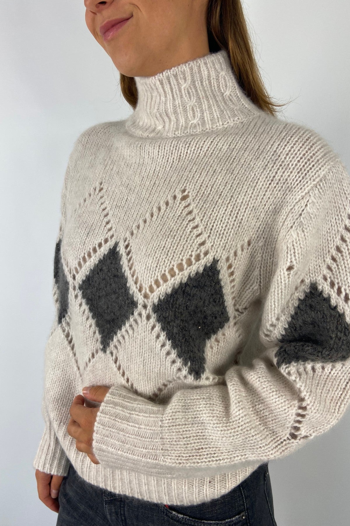 Warme beige pull met rolkraag met diamantvormig bicolor ruitpatroon.