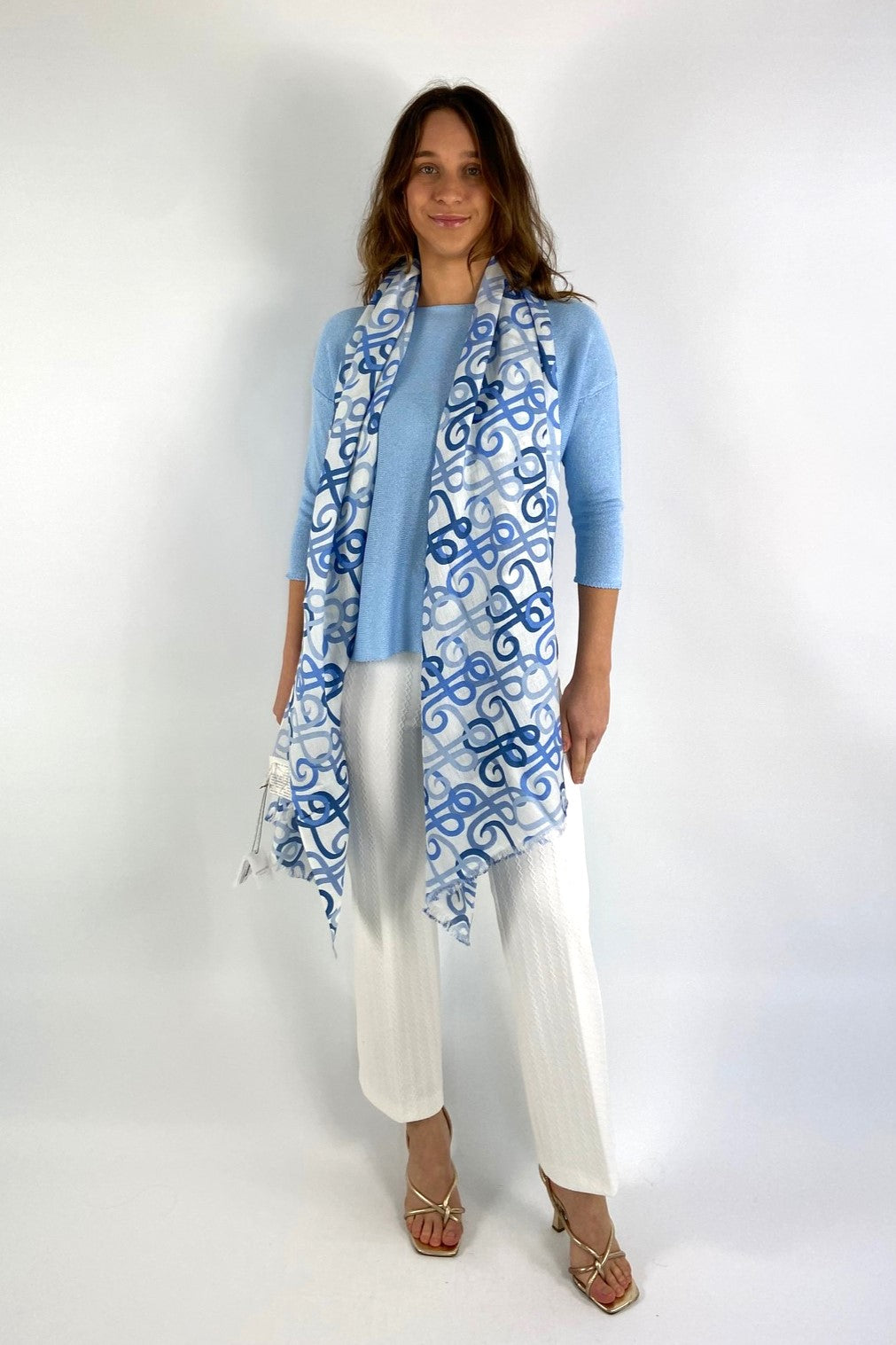 Sjaal met franjes van Hemisphere in een wol kwaliteit. Geometrische dessin in lichtblauwe tinten in combinatie met beige olifantjes op de rand.