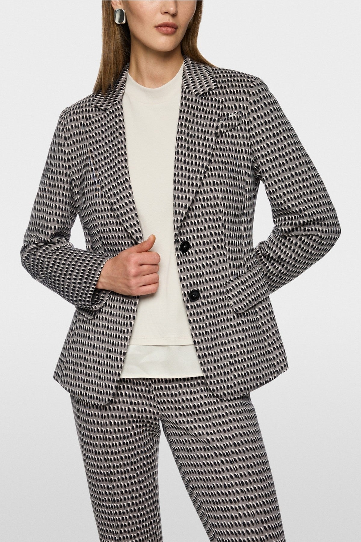 Moderne blazer met comfortabele scubajersey met trendy sprinkles-print. De getailleerde vorm, twee knopen, kleppen en de afgeronde zoom.