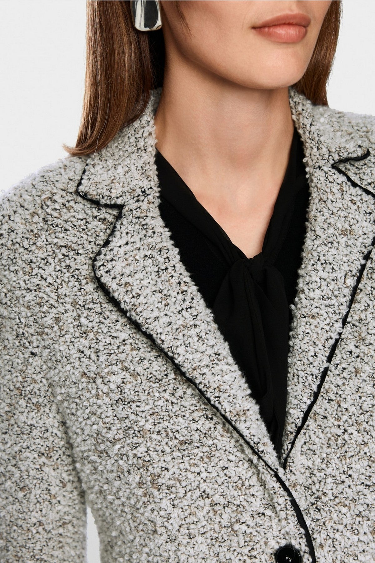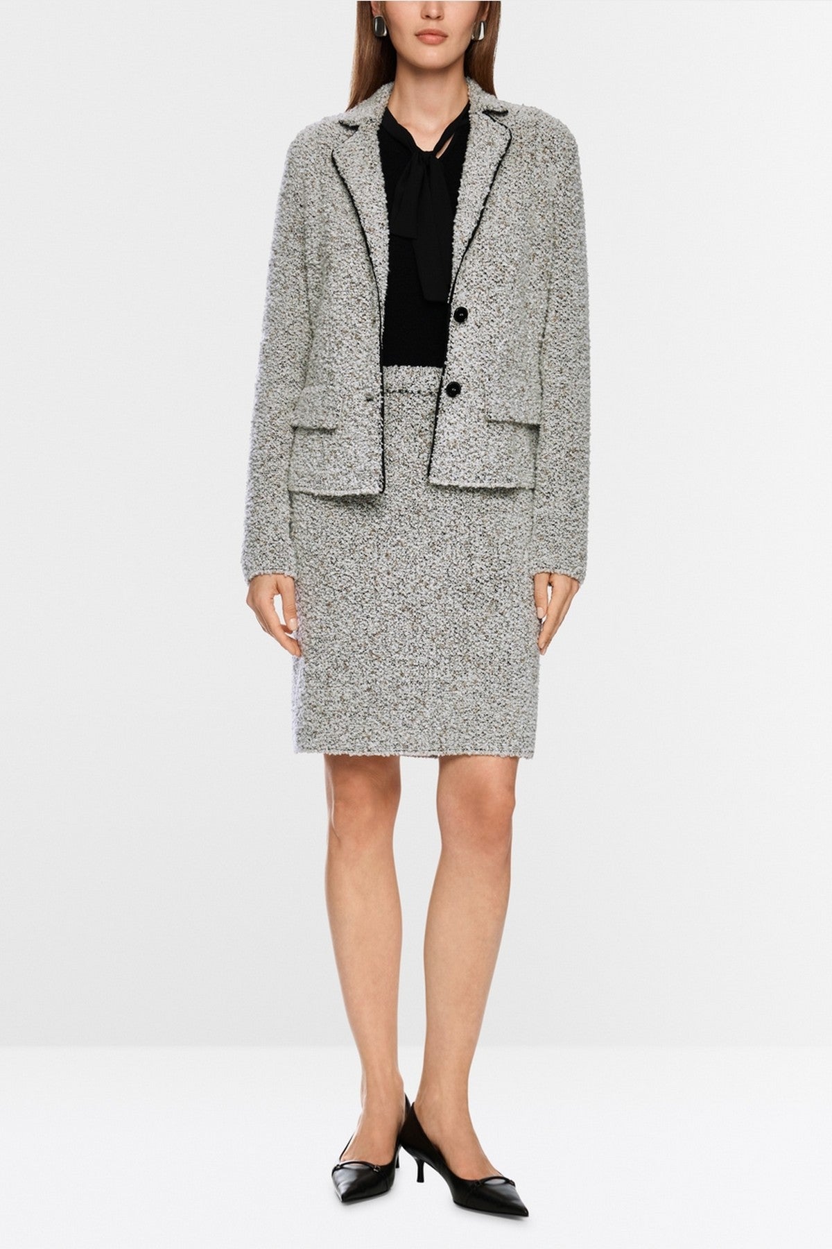 Getailleerde bouclé blazer van Marc Cain in grijze 'Smoke' tint, met twee knopen, klepzakken en contrasterende paspels.