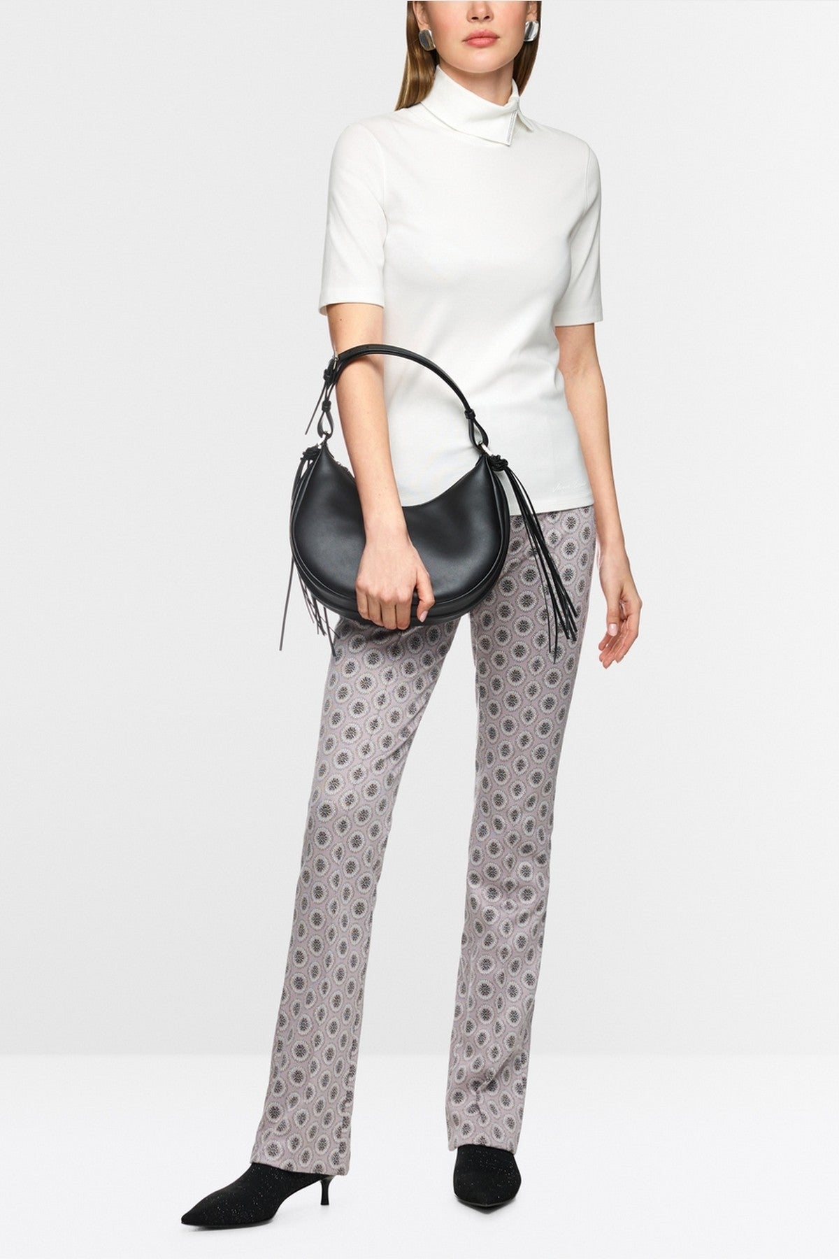 Damesbroek met ornamentdesign in  stretch-scubajersey met vrouwelijke pasvorm. Ritssluiting en knoop op normale hoogte. Gestikte persvouwen en een subtiele split bij de enkel onderstrepen de chique stijl.