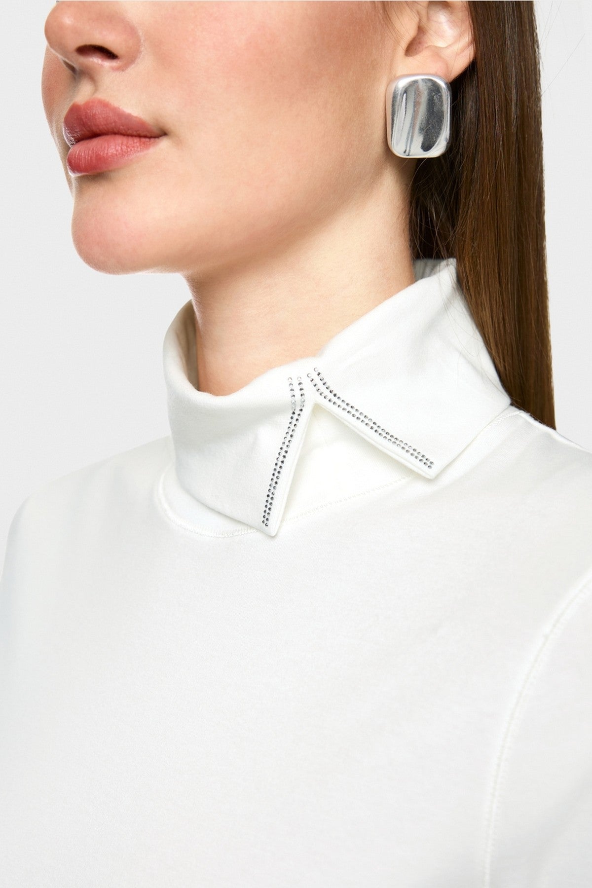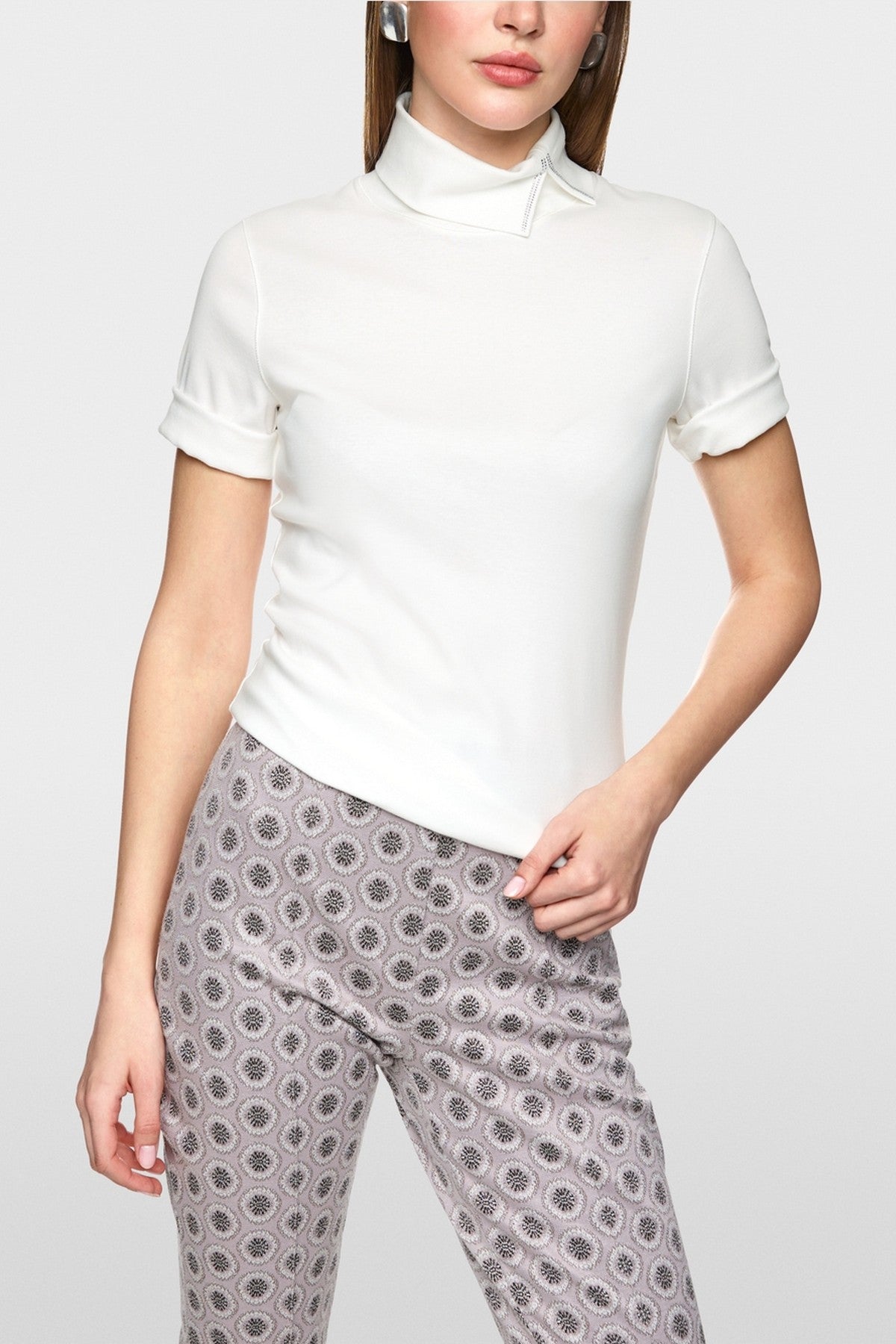 Stijlvol T-shirt in off-white met col en subtiel glanzend detail. De nauwsluitende pasvorm en zachte katoenmix zorgen voor een elegante look en hoog draagcomfort.