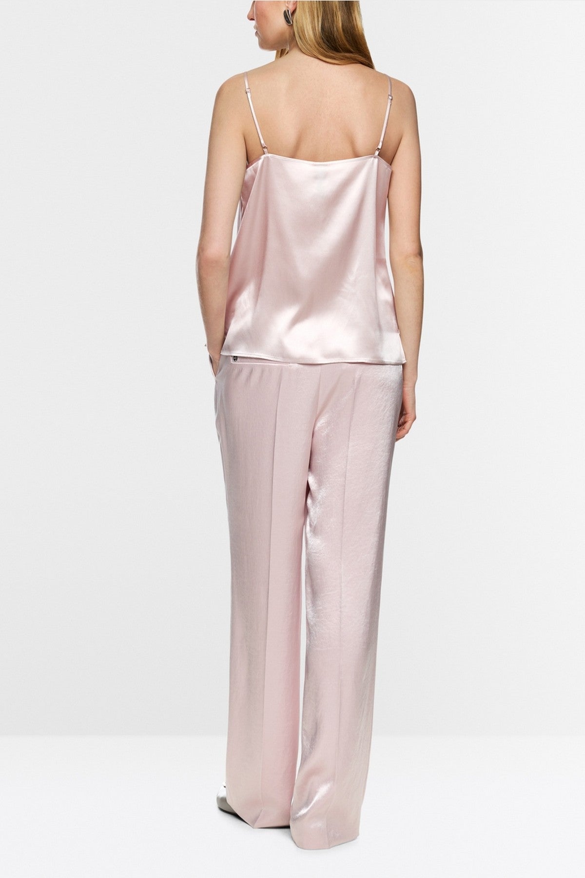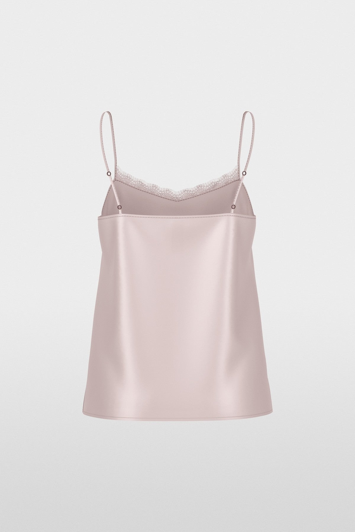 Delicate top van 100% zijde met kanten inzet aan de V-hals, verstelbare bandjes, coupenaden en licht A-lijn silhouet. Vrouwelijk en elegant.