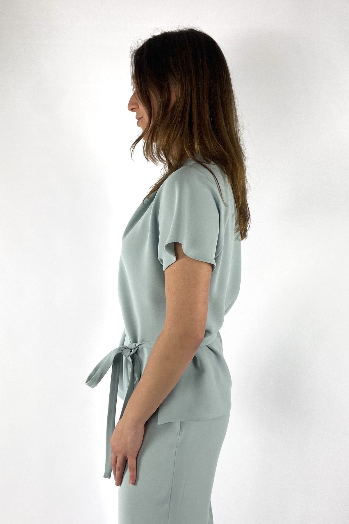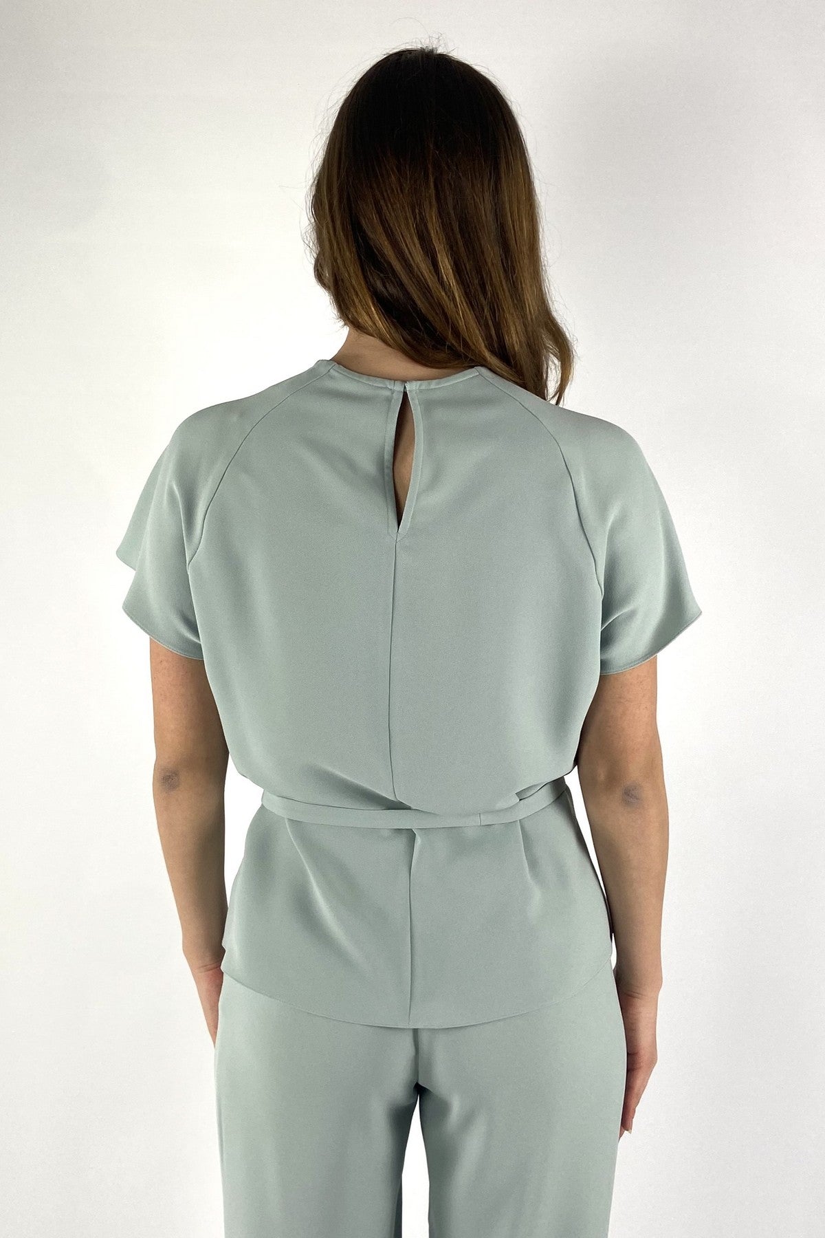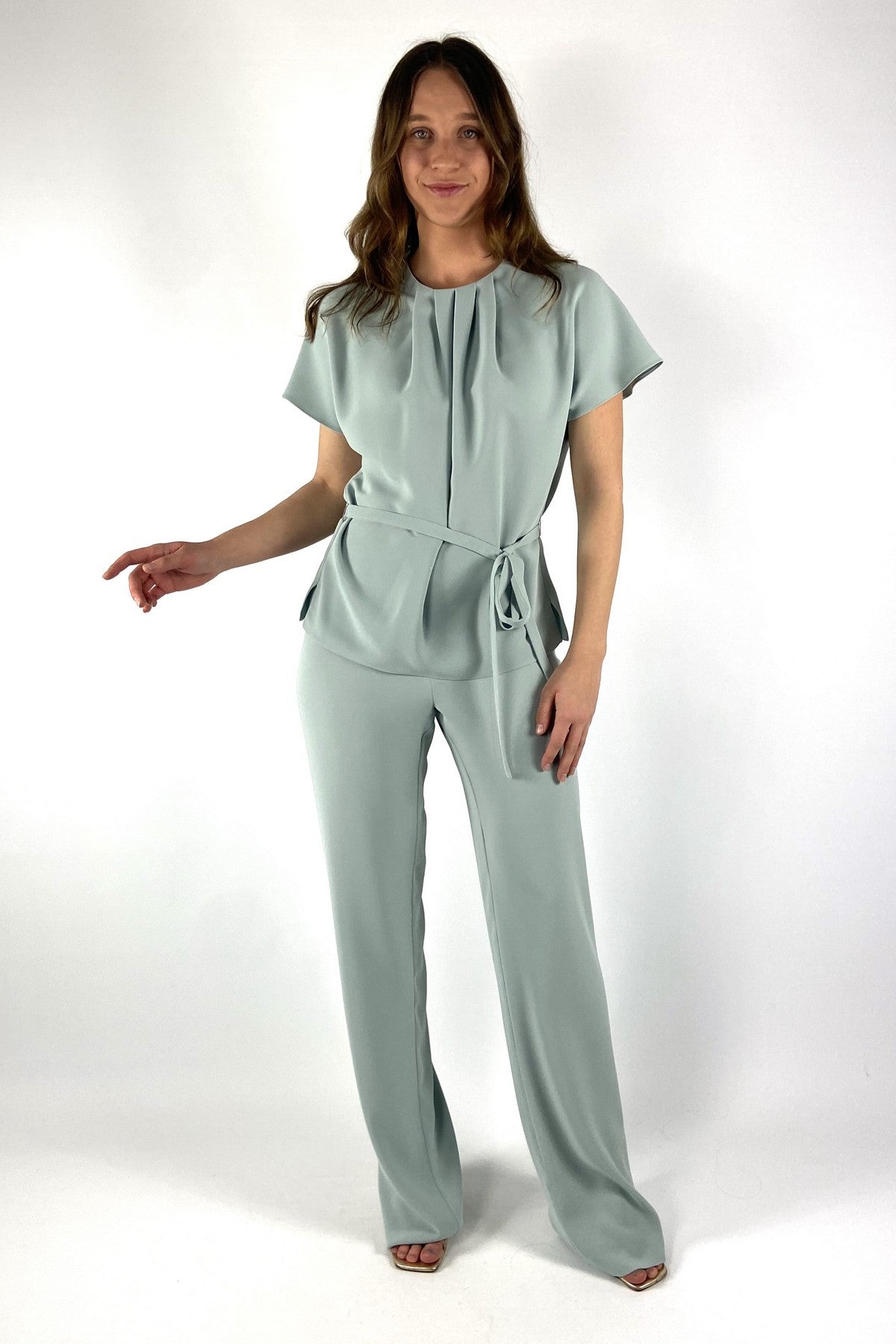 Mintgroene Natan Elton top met een gesmokte ronde hals, kapmouwtjes en een smal ceintuurtje in de taille.