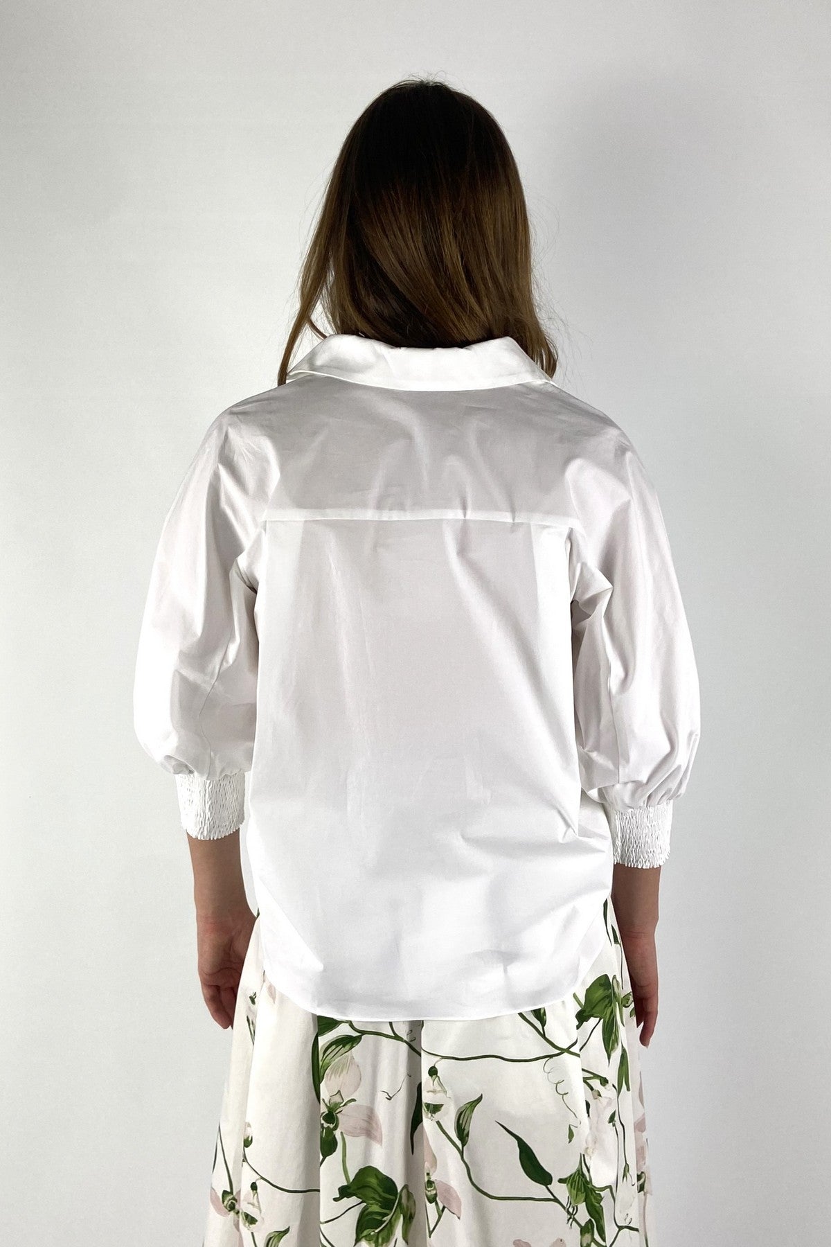 Wit katoen-popeline Enoa bloes van Natan met een V-hals, klassieke kraag en volumineuze driekwart pofmouwen.