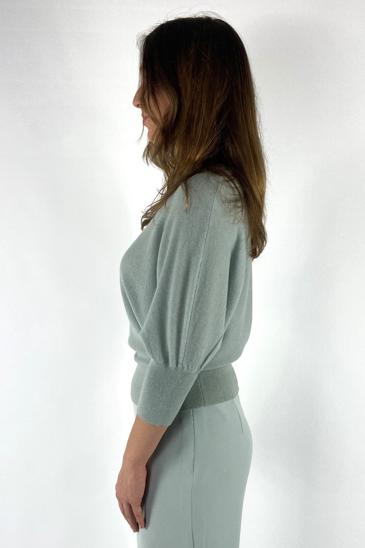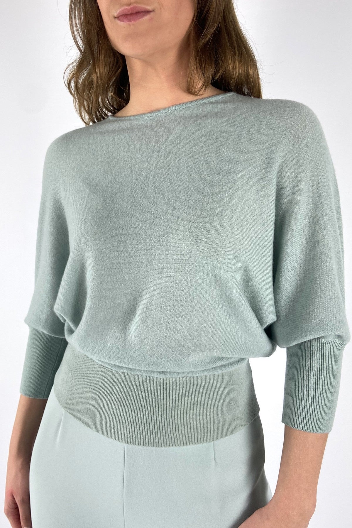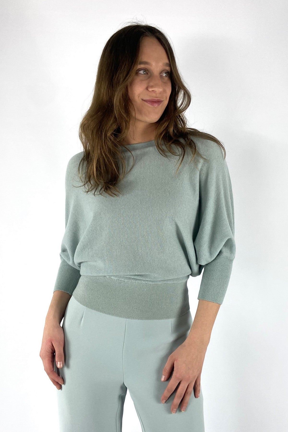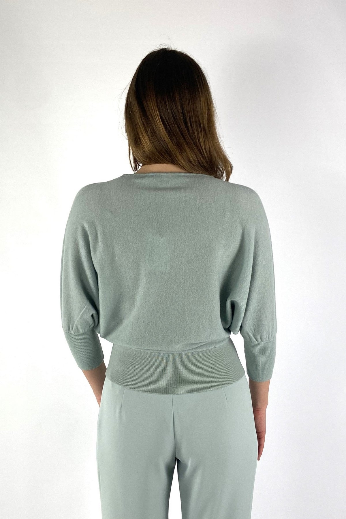 Zacht mintgroene Nerd trui van Natan met een ronde hals en driekwart mouwen met brede manchetten.