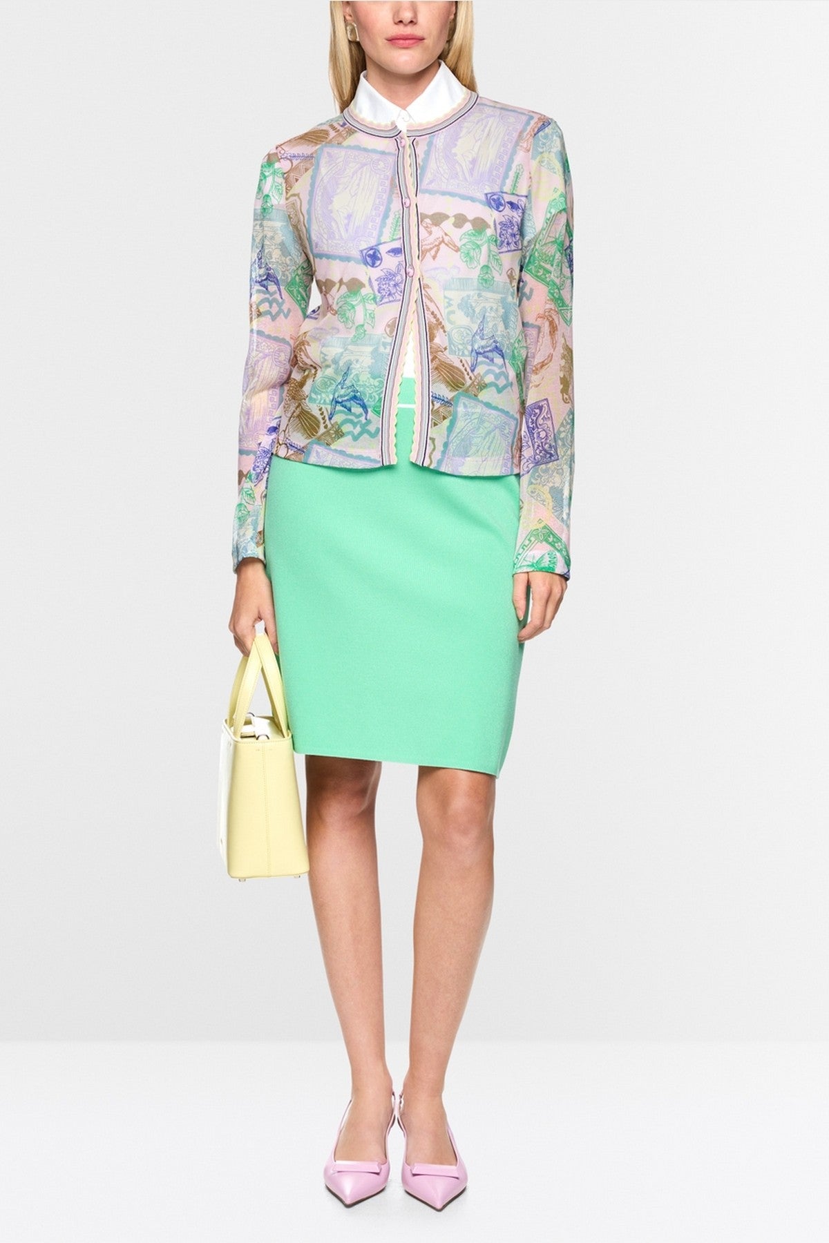 Marc Cain Collections bedrukte cardigan pink tulle met stempelprint en ronde hals.