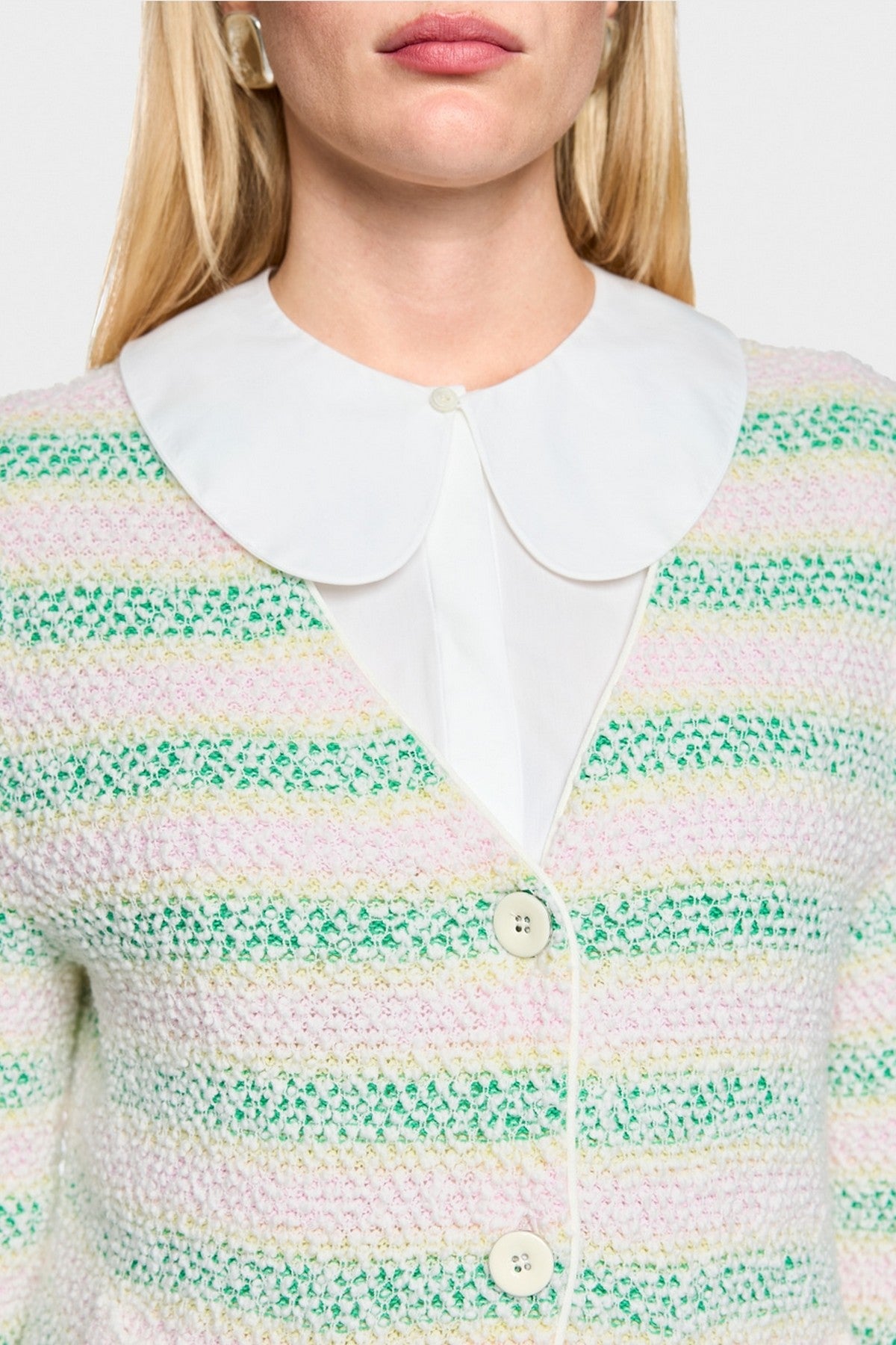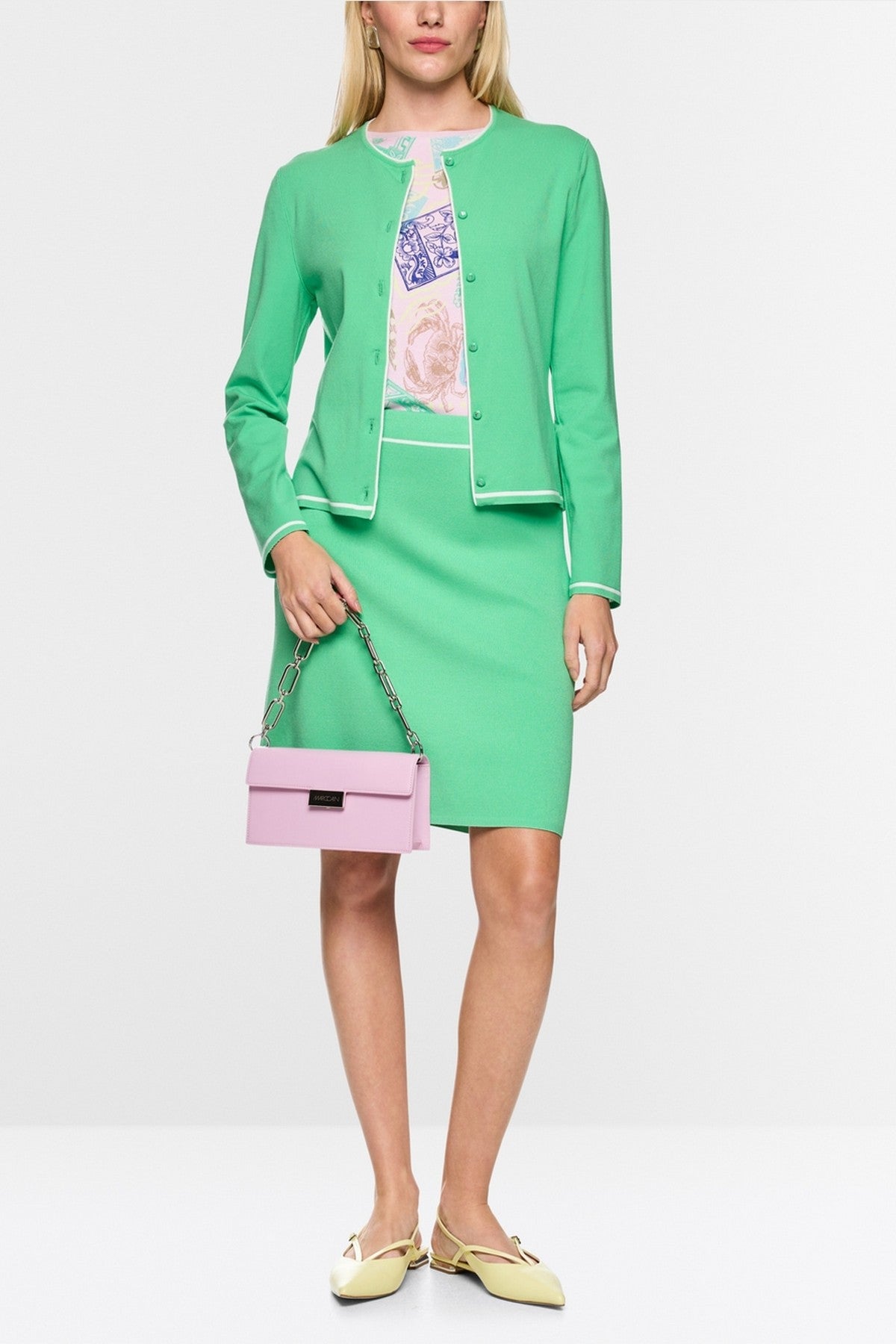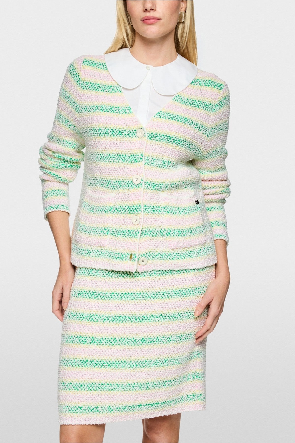 Marc Cain Collections bouclé cardigan in bright jade groen met V-hals en knoopsluiting.