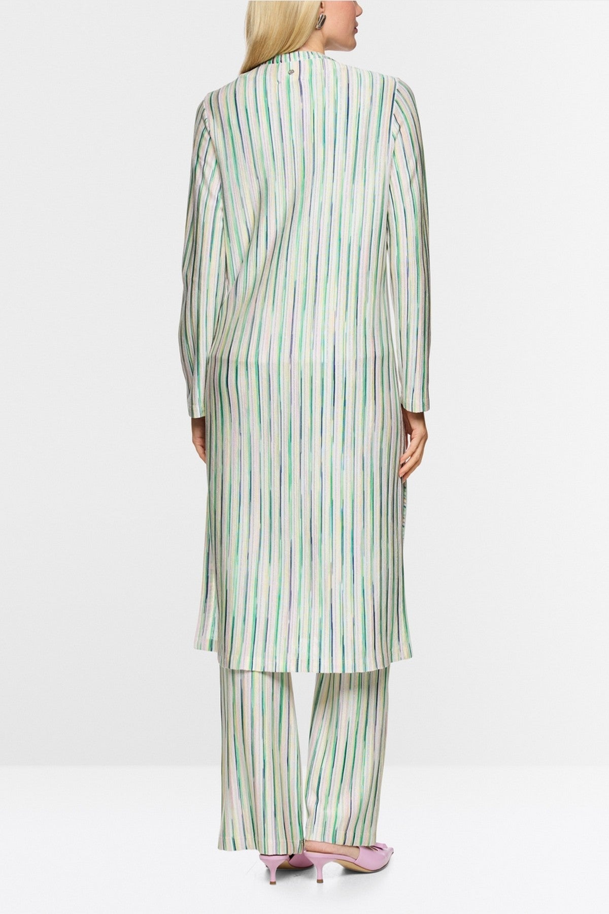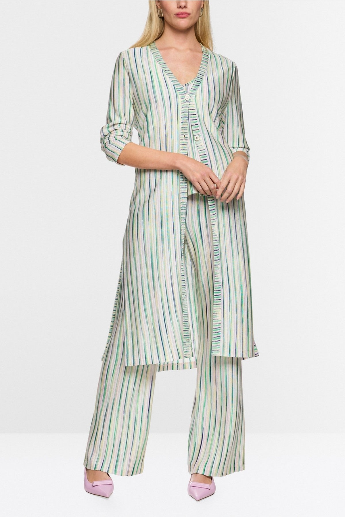 Marc Cain Collections lange gebreide jas in pink tulle met lurex glans en V-hals.