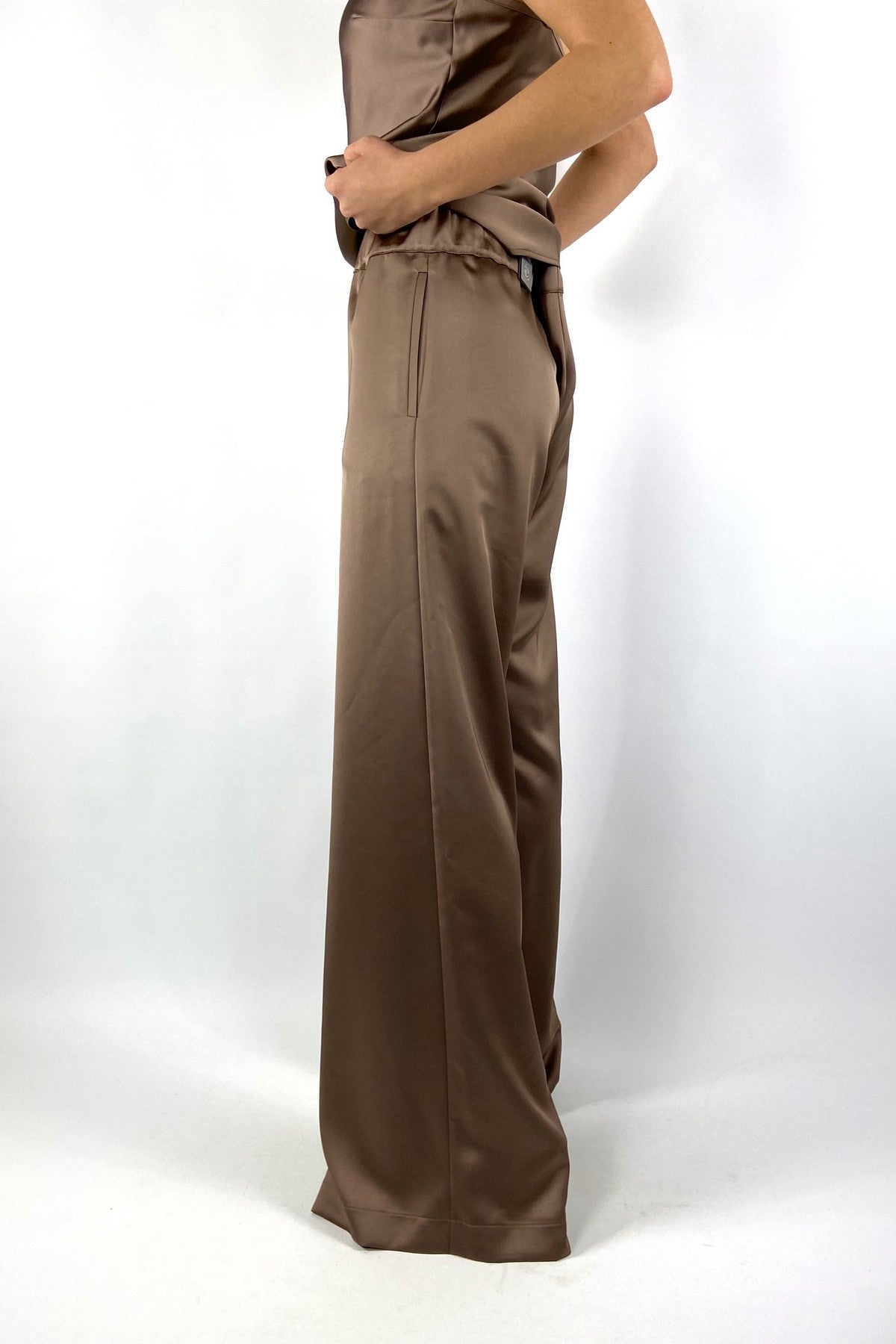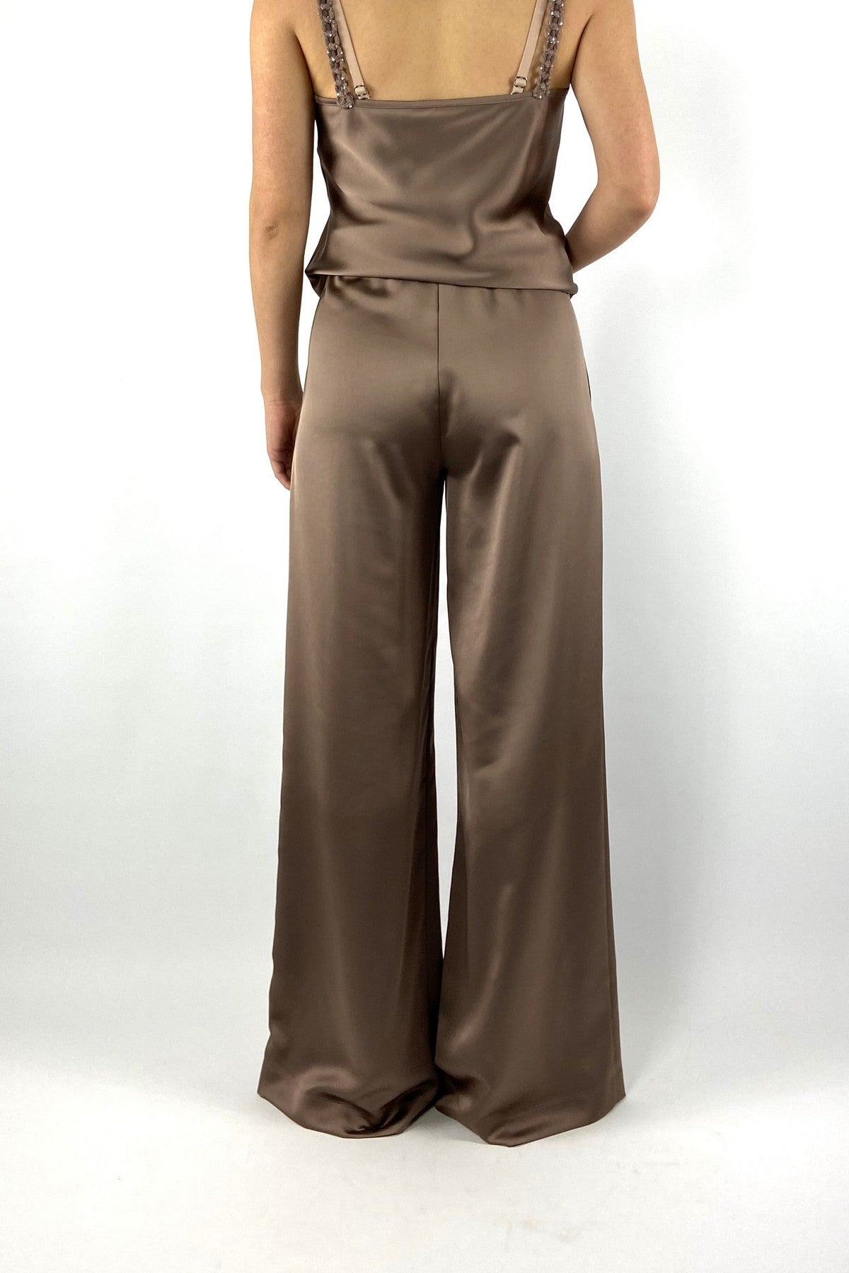 62663-6: Wijde satijnen palazzo broek van D.Exterior in kleur Mocha met een comfortabele elastische tailleband.
