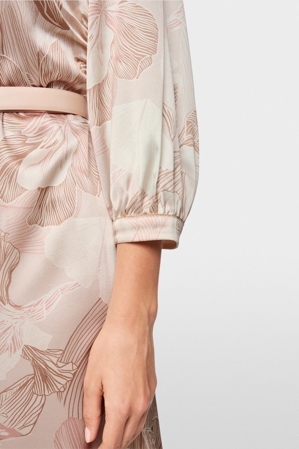 Midi-jurk in zijdekeper met kimono-halslijn, wijde mouwen en elegante pasvorm. Uitgevoerd in een opvallende print van Japanse camelia’s.